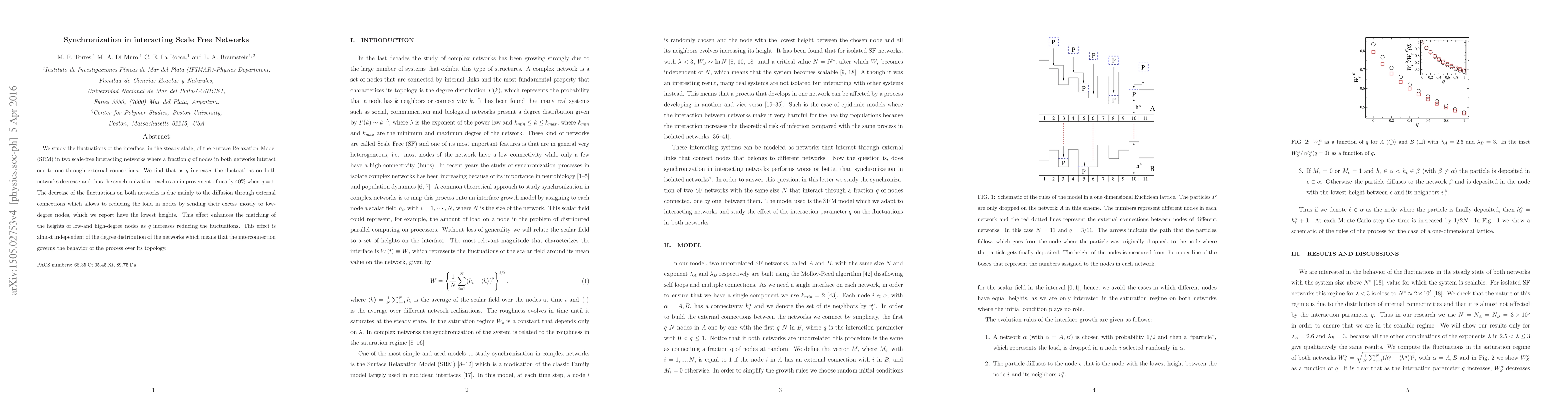 We study the fluctuations of the interface, in the steady state, of the Surface Relaxation Model (SRM) in two scale free interacting networks where a fraction $q$ of nodes in both networks interact one to one through external connections. We find that as $q$ increases the fluctuations on both networks decrease and thus the synchronization reaches an improvement of nearly $40\%$ when $q=1$. The decrease of the fluctuations on both networks is due mainly to the diffusion through external connections which allows to reducing the load in nodes by sending their excess mostly to low-degree nodes, which we report have the lowest heights. This effect enhances the matching of the heights of low-and high-degree nodes as $q$ increases reducing the fluctuations. This effect is almost independent of the degree distribution of the networks which means that the interconnection governs the behavior of the process over its topology.