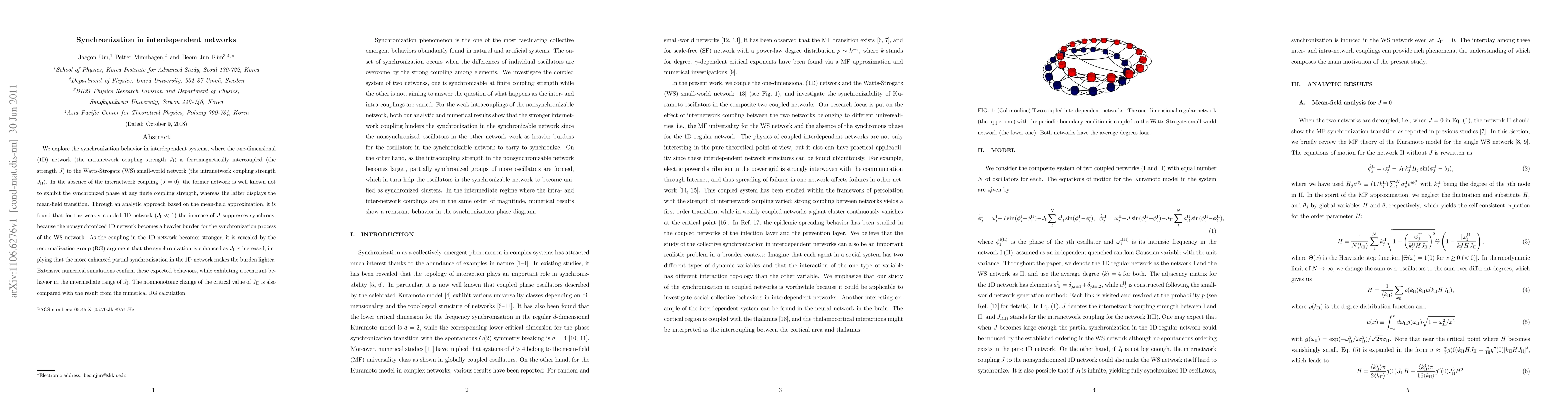 This paper investigates synchronization dynamics in interdependent networks, specifically a 1D ferromagnetic network coupled with a Watts-Strogatz small-world network. It finds that weak coupling between the networks suppresses synchronization, while stronger coupling enhances it, confirmed by both analytic and numerical methods, revealing a reentrant synchronization behavior.
