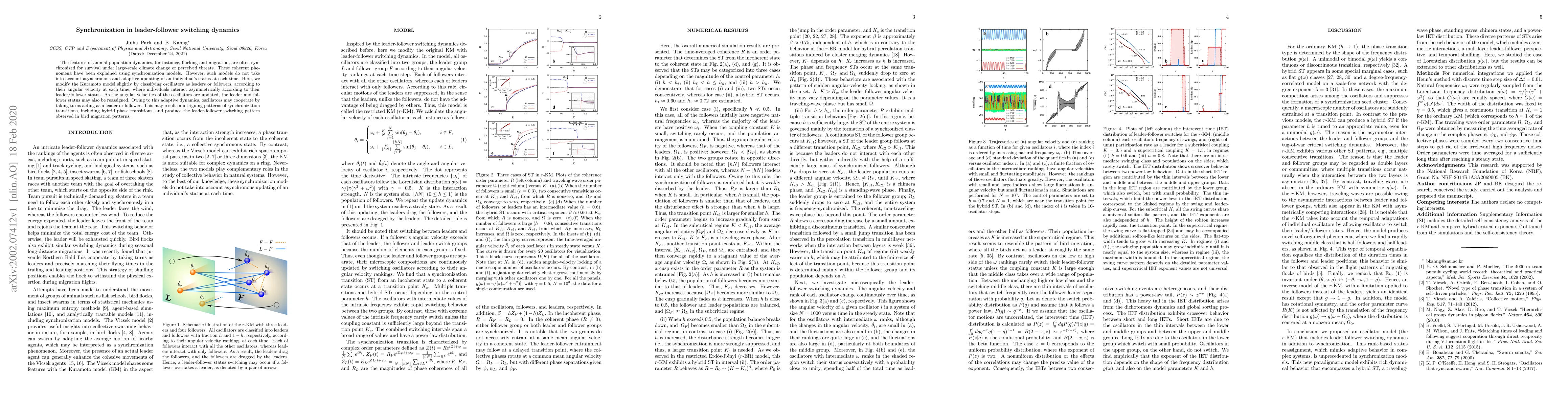 This paper modifies the Kuramoto model to incorporate leader-follower dynamics, where oscillators' statuses can switch adaptively based on their angular velocity. This adaptive updating leads to intriguing synchronization patterns, including hybrid phase transitions, mirroring observed leader-follower switching in bird migration.