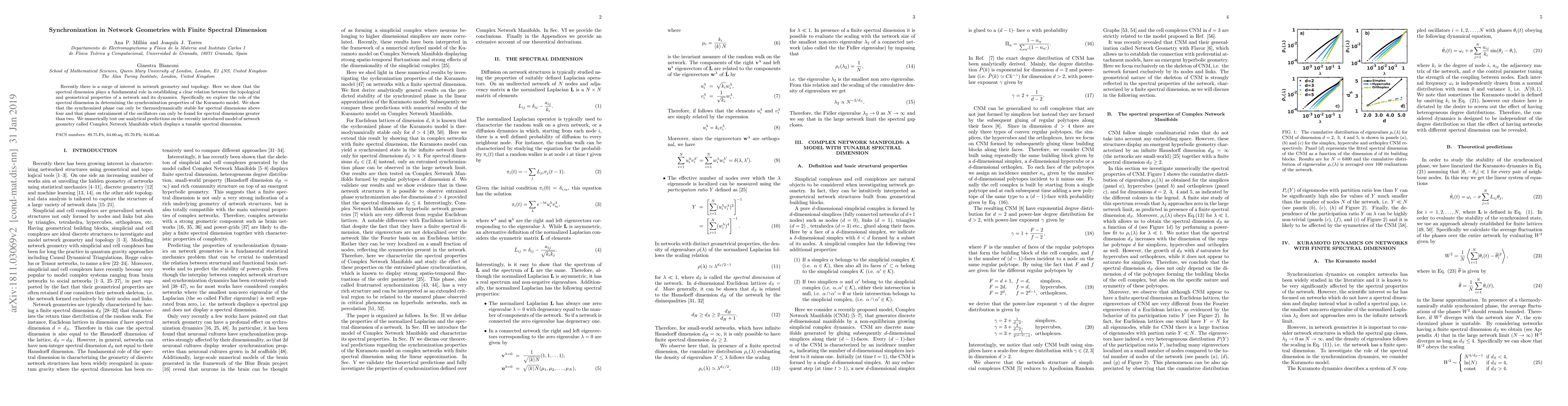 This paper investigates how the spectral dimension of network geometries influences synchronization dynamics in the Kuramoto model. It finds that synchronization is thermodynamically stable only for spectral dimensions above four, and phase entrainment occurs for dimensions greater than two, tested numerically on Complex Network Manifolds.