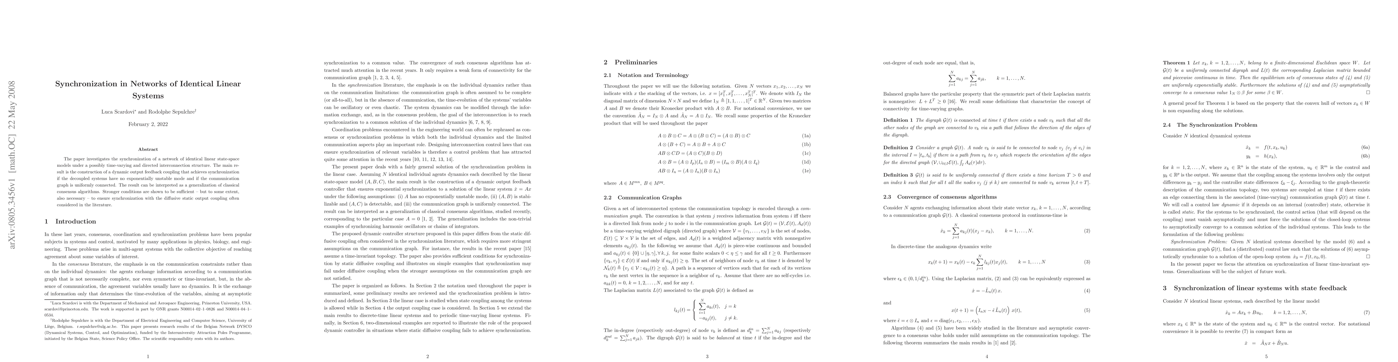 This paper explores synchronization in networks of identical linear systems with time-varying, directed connections, proposing a dynamic output feedback coupling method that achieves synchronization under uniform connectivity and absence of unstable modes. It generalizes classical consensus algorithms, showing that stronger conditions are both sufficient and necessary for synchronization with static output coupling.