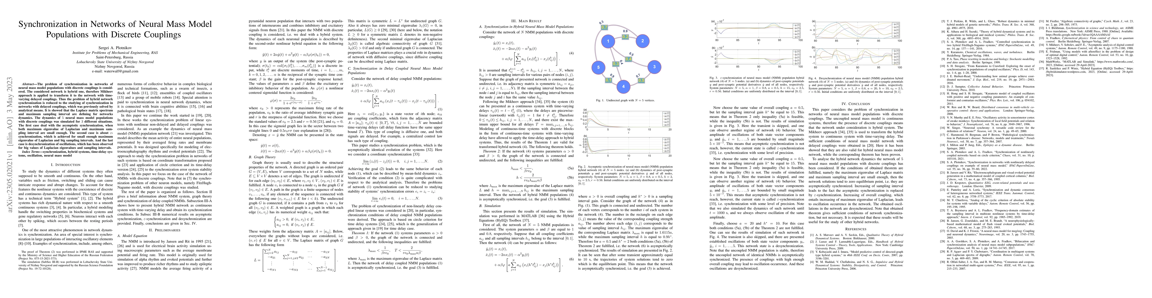 The problem of synchronization in networks of neural mass model populations with discrete couplings is considered. The considered network is hybrid one, therefore Mikheev approach is applied to transform it to the network with time-varying delayed couplings. Thus the problem of hybrid network synchronization is reduced to the studying of synchronization in networks with delayed couplings, which was previously solved by analytical means. It is showed that the Laplace matrix spectrum and maximum sampling interval are defining for networks dynamics. The dynamics of 5 neural mass model populations with discrete couplings was simulated for 3 different situations. The first case deal with the asymptotic synchronization, when both maximum eigenvalue of Laplacian and maximum sampling interval are small enough. The second case is about e-synchronization, which is achieved for small enough maximum eigenvalue of Laplacian and big sampling intervals. And the last case is desynchronization of oscillations, which has been observed for big values of Laplacian eigenvalues and sampling intervals.