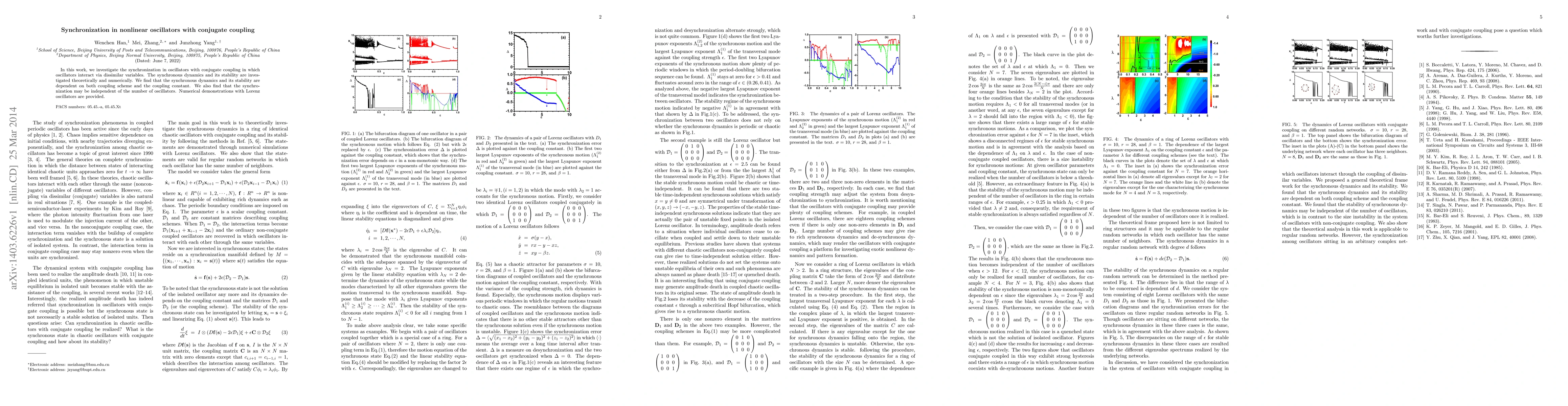 In this work, we investigate the synchronization in oscillators with conjugate coupling in which oscillators interact via dissimilar variables. The synchronous dynamics and its stability are investigated theoretically and numerically. We find that the synchronous dynamics and its stability are dependent on both coupling scheme and the coupling constant. We also find that the synchronization may be independent of the number of oscillators. Numerical demonstrations with Lorenz oscillators are provided.