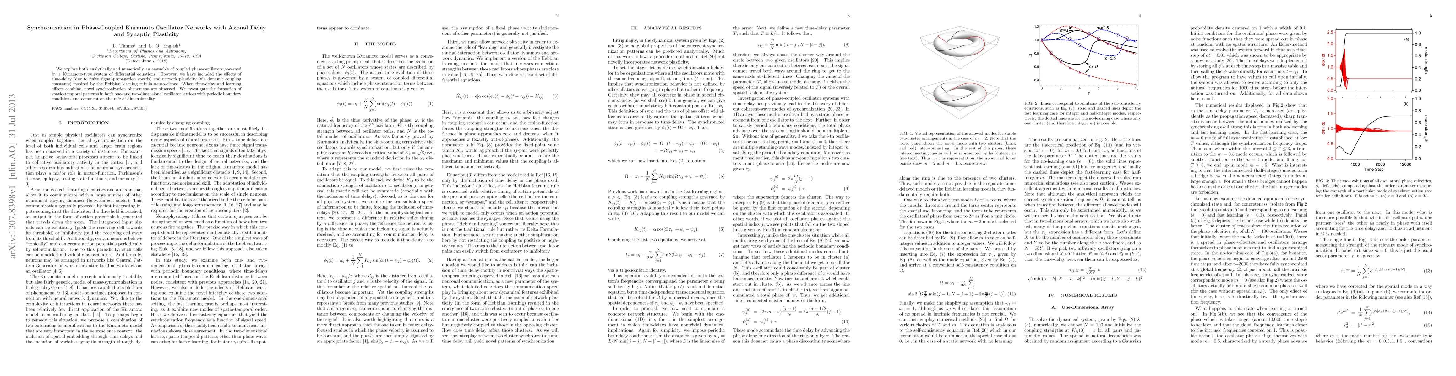 This paper investigates synchronization in Kuramoto oscillator networks with axon delays and synaptic plasticity, revealing novel synchronization phenomena when time-delay and learning effects interact. It examines spatio-temporal patterns in one- and two-dimensional lattices, highlighting the impact of dimensionality on synchronization dynamics.