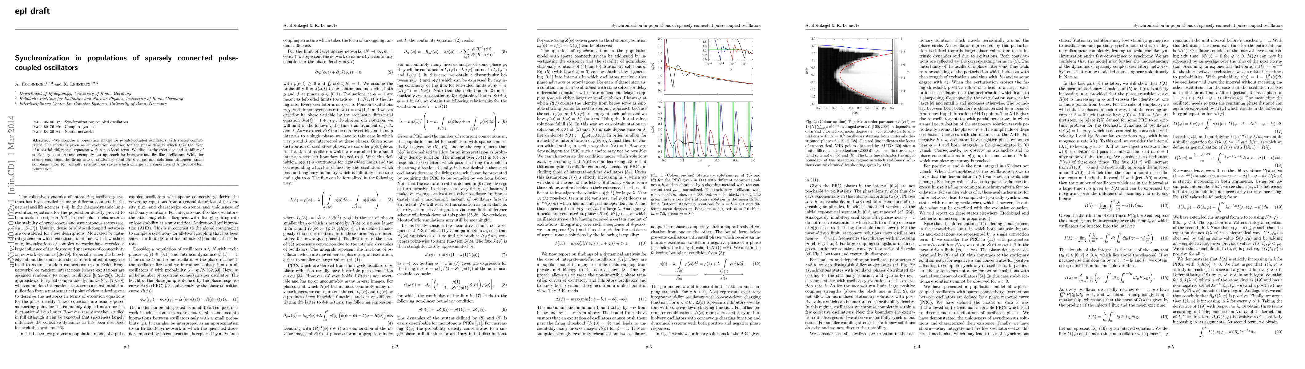 This paper models sparsely connected pulse-coupled oscillators using a partial differential equation for phase density, exploring the existence and stability of stationary solutions. Small couplings enable partially synchronous states emerging at a supercritical Andronov-Hopf bifurcation, contrasting with the divergence of firing rates under strong couplings.