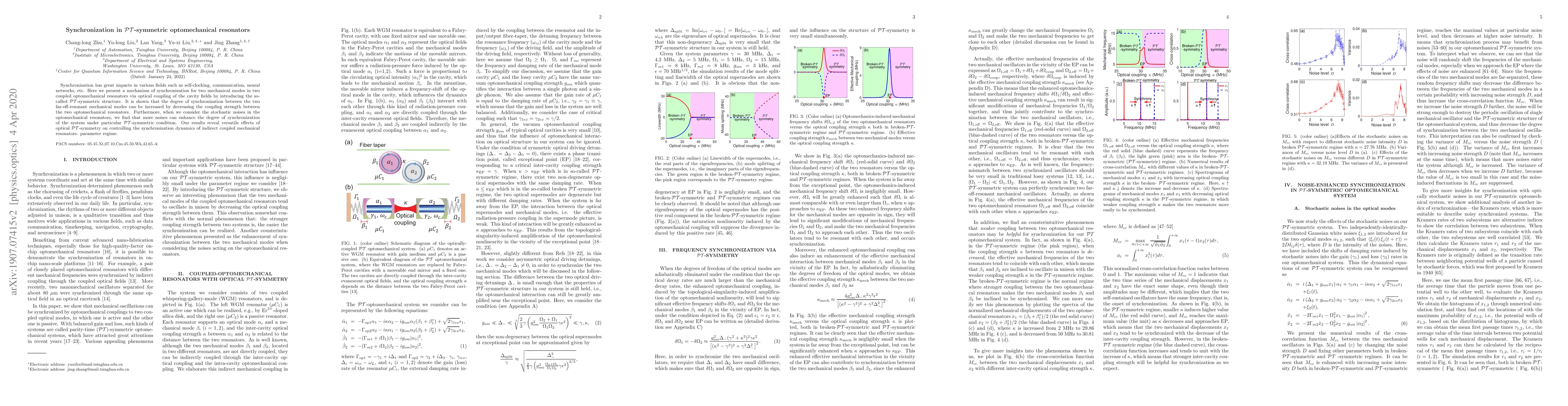 This paper explores synchronization mechanisms in PT-symmetric optomechanical resonators, demonstrating that decreasing coupling strength enhances synchronization between mechanical modes. It also reveals that under certain conditions, stochastic noise can further boost synchronization, suggesting new research avenues for PT-symmetric systems.