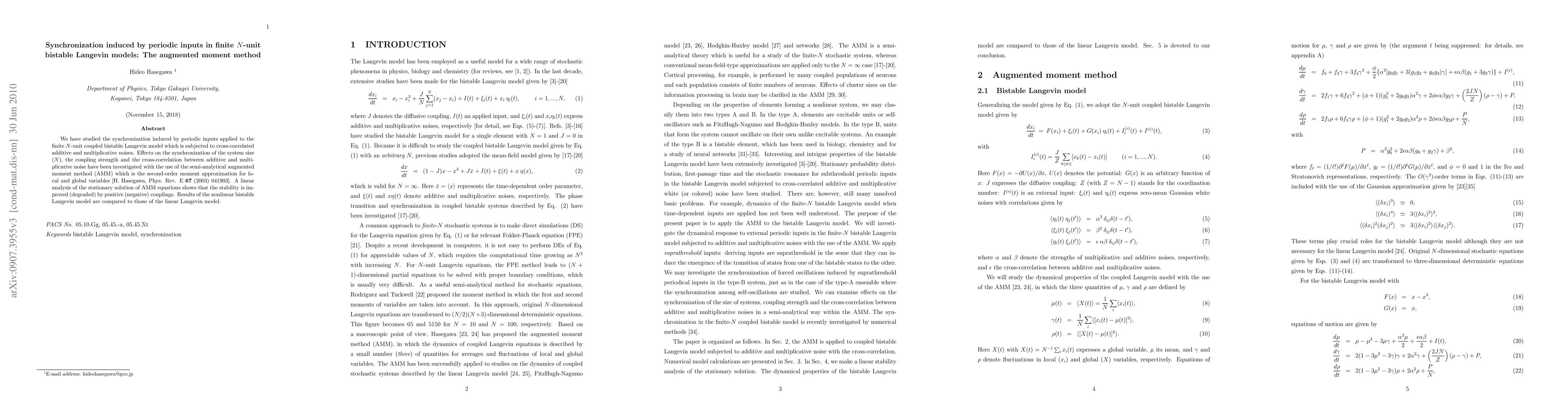 We have studied the synchronization induced by periodic inputs applied to the finite $N$-unit coupled bistable Langevin model which is subjected to cross-correlated additive and multiplicative noises. Effects on the synchronization of the system size ($N$), the coupling strength and the cross-correlation between additive and multiplicative noises have been investigated with the use of the semi-analytical augmented moment method (AMM) which is the second-order moment approximation for local and global variables [H. Hasegawa, Phys. Rev. E {\bf 67} (2003) 041903]. A linear analysis of the stationary solution of AMM equations shows that the stability is improved (degraded) by positive (negative) couplings. Results of the nonlinear bistable Langevin model are compared to those of the linear Langevin model.