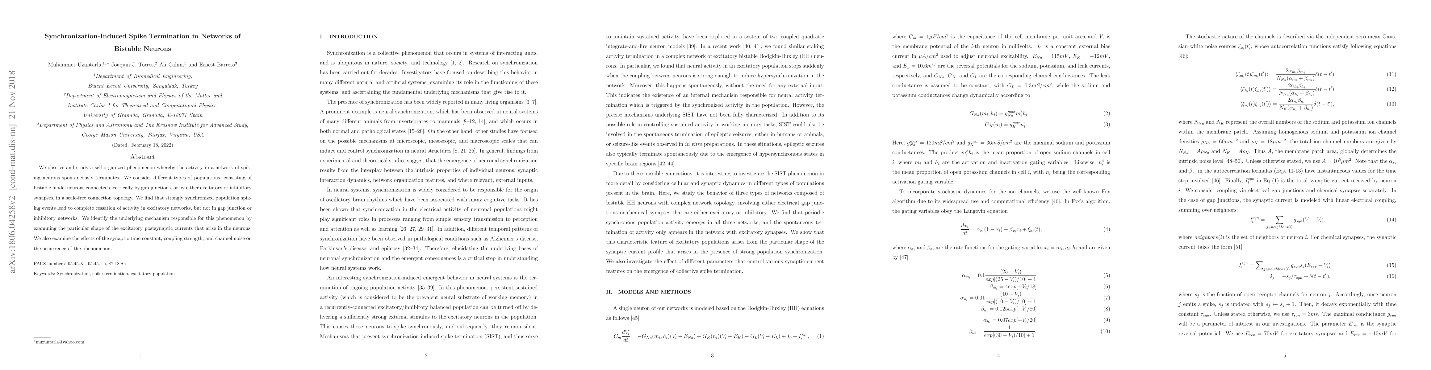 A network of spiking neurons spontaneously terminates its activity when strongly synchronized, but this phenomenon occurs only in networks with excitatory connections and not in gap junction or inhibitory networks.