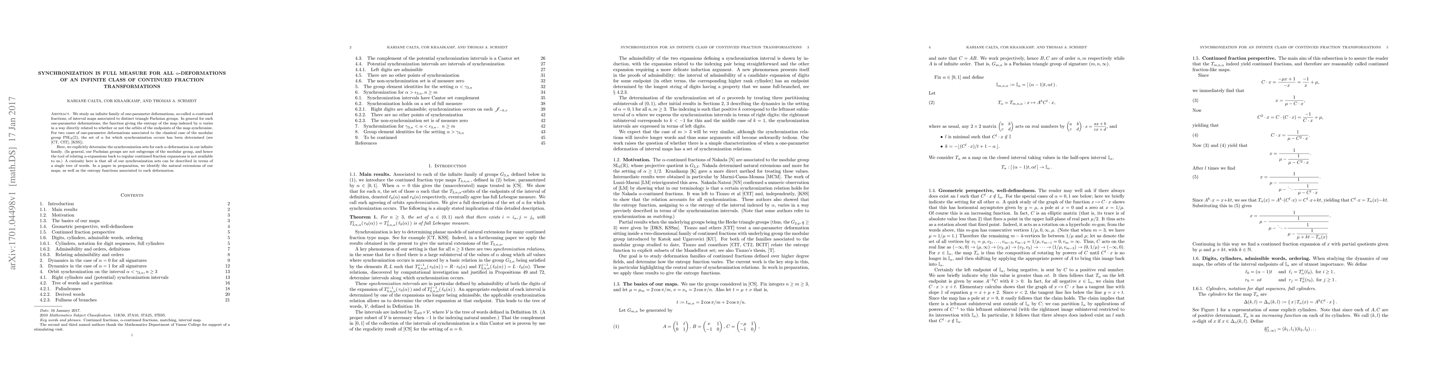 We study an infinite family of one-parameter deformations, so-called $\alpha$-continued fractions, of interval maps associated to distinct triangle Fuchsian groups. In general for such one-parameter deformations, the function giving the entropy of the map indexed by $\alpha$ varies in a way directly related to whether or not the orbits of the endpoints of the map synchronize. For two cases of one-parameter deformations associated to the classical case of the modular group $\text{PSL}_2(\mathbb Z)$, the set of $\alpha$ for which synchronization occurs has been determined. Here, we explicitly determine the synchronization sets for each $\alpha$-deformation in our infinite family. (In general, our Fuchsian groups are not subgroups of the modular group, and hence the tool of relating $\alpha$-expansions back to regular continued fraction expansions is not available to us.) A curiosity here is that all of our synchronization sets can be described in terms of a single tree of words. In a paper in preparation, we identify the natural extensions of our maps, as well as the entropy functions associated to each deformation.
