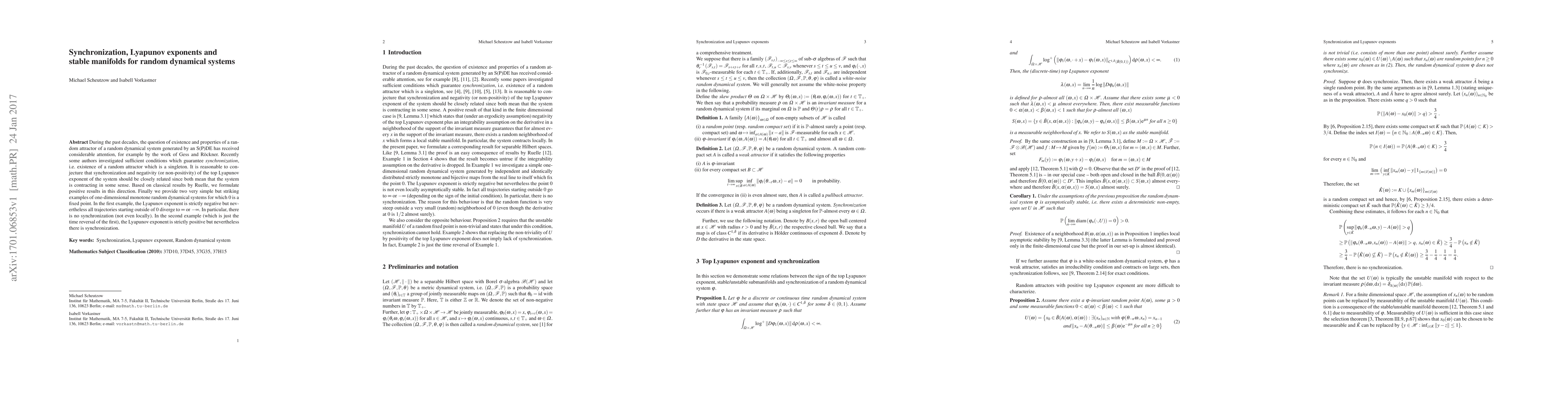 During the past decades, the question of existence and properties of a random attractor of a random dynamical system generated by an S(P)DE has received considerable attention, for example by the work of Gess and R\"ockner. Recently some authors investigated sufficient conditions which guarantee synchronization, i.e. existence of a random attractor which is a singleton. It is reasonable to conjecture that synchronization and negativity (or non-positivity) of the top Lyapunov exponent of the system should be closely related since both mean that the system is contracting in some sense. Based on classical results by Ruelle, we formulate positive results in this direction. Finally we provide two very simple but striking examples of one-dimensional monotone random dynamical systems for which 0 is a fixed point. In the first example, the Lyapunov exponent is strictly negative but nevertheless all trajectories starting outside of 0 diverge to $\infty$ or $-\infty$. In particular, there is no synchronization (not even locally). In the second example (which is just the time reversal of the first), the Lyapunov exponent is strictly positive but nevertheless there is synchronization.