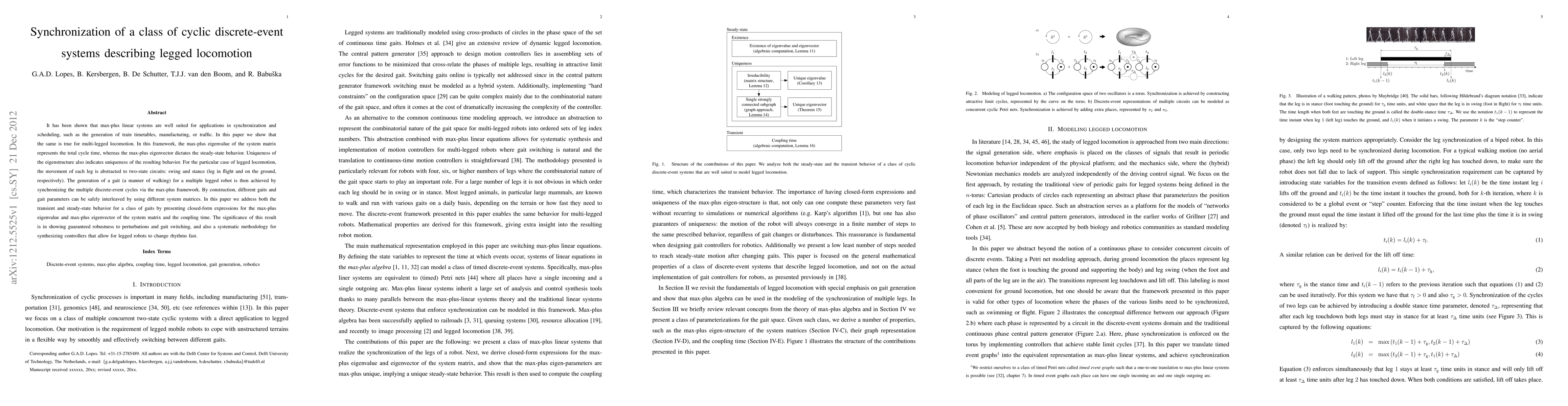 It has been shown that max-plus linear systems are well suited for applications in synchronization and scheduling, such as the generation of train timetables, manufacturing, or traffic. In this paper we show that the same is true for multi-legged locomotion. In this framework, the max-plus eigenvalue of the system matrix represents the total cycle time, whereas the max-plus eigenvector dictates the steady-state behavior. Uniqueness of the eigenstructure also indicates uniqueness of the resulting behavior. For the particular case of legged locomotion, the movement of each leg is abstracted to two-state circuits: swing and stance (leg in flight and on the ground, respectively). The generation of a gait (a manner of walking) for a multiple legged robot is then achieved by synchronizing the multiple discrete-event cycles via the max-plus framework. By construction, different gaits and gait parameters can be safely interleaved by using different system matrices. In this paper we address both the transient and steady-state behavior for a class of gaits by presenting closed-form expressions for the max-plus eigenvalue and max-plus eigenvector of the system matrix and the coupling time. The significance of this result is in showing guaranteed robustness to perturbations and gait switching, and also a systematic methodology for synthesizing controllers that allow for legged robots to change rhythms fast.
