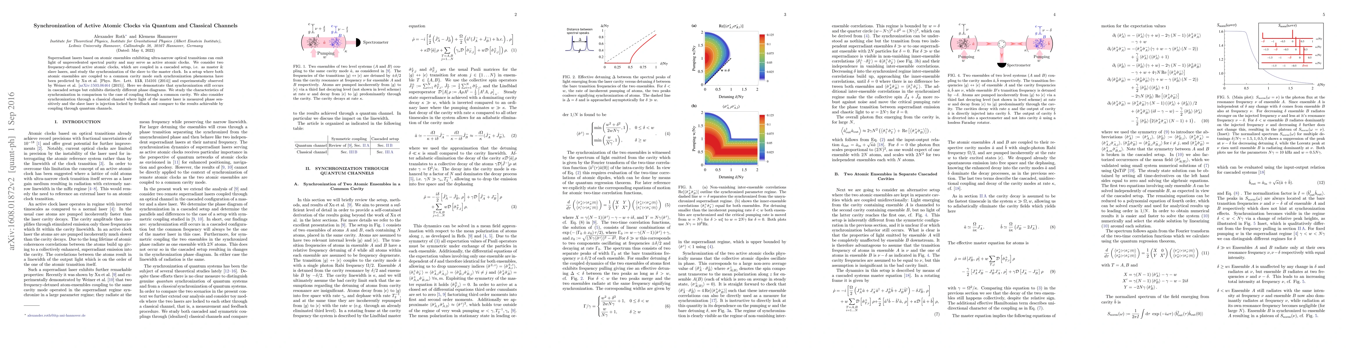 This paper investigates the synchronization of two active atomic clocks—master and slave—in both quantum and classical coupling scenarios. It demonstrates distinct synchronization behavior in cascaded setups compared to common cavity coupling and examines the effectiveness of classical feedback methods versus quantum channels for synchronization.