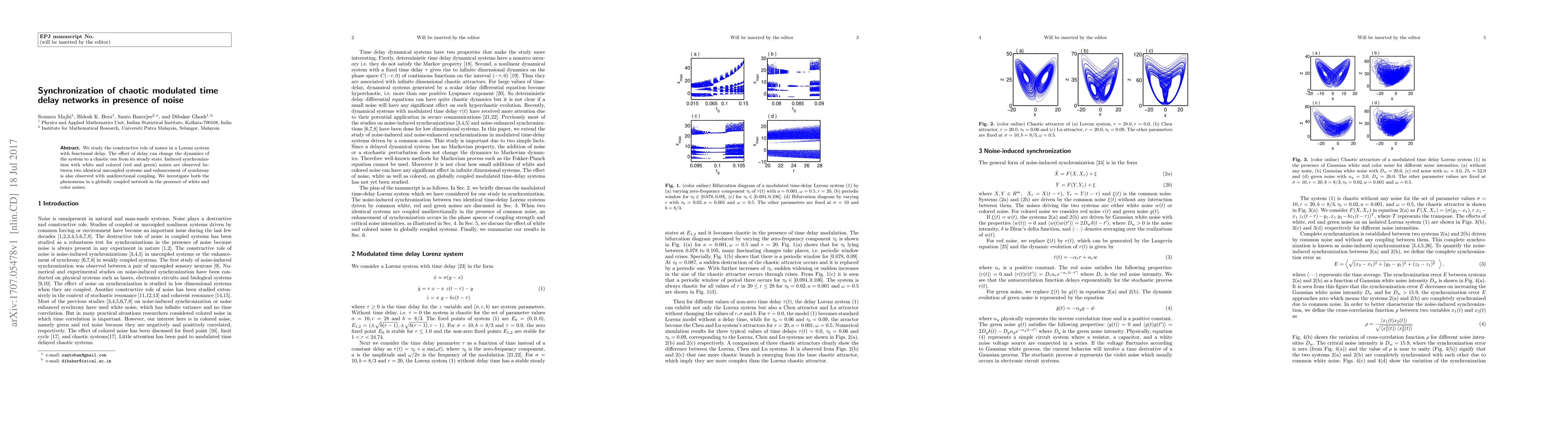 We study the constructive role of noises in a Lorenz system with functional delay. The effect of delay can change the dynamics of the system to a chaotic one from its steady state. Induced synchronization with white and colored (red and green) noises are observed between two identical uncoupled systems and enhancement of synchrony is also observed with unidirectional coupling. We investigate both the phenomena in a globally coupled network in the presence of white and color noises.