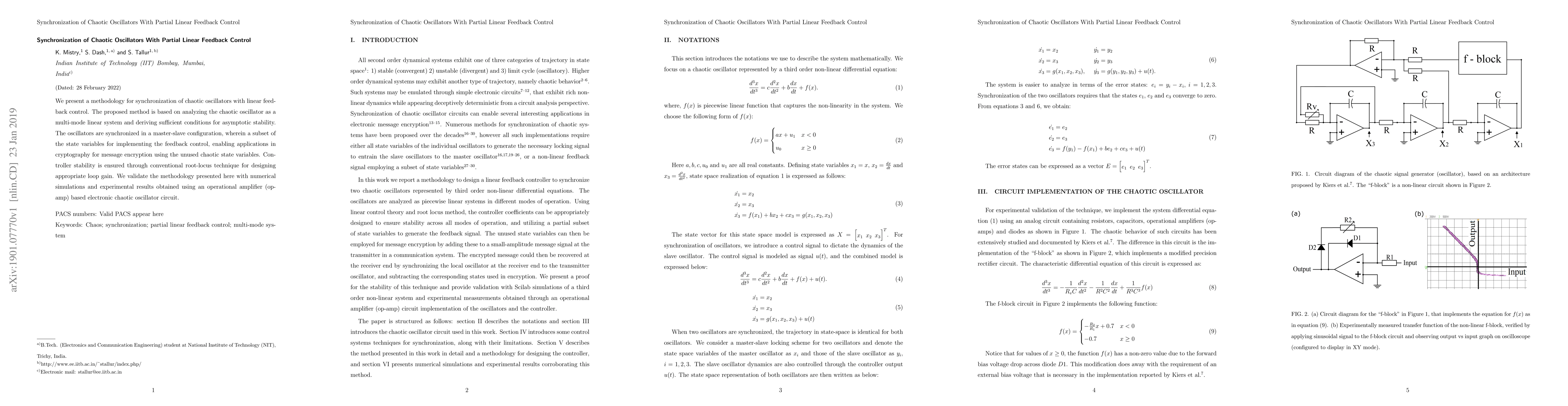 The use of partial linear feedback control for synchronization of chaotic oscillators is a new and innovative approach.