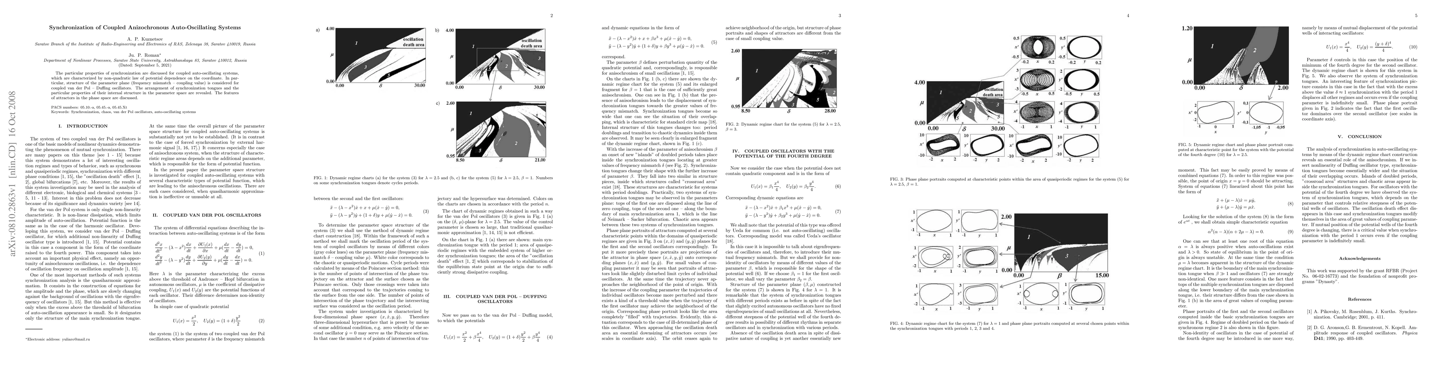 This paper explores synchronization in coupled anizochronous auto-oscillating systems with non-quadratic potential laws, focusing on van der Pol-Duffing oscillators. It investigates the parameter plane of frequency mismatch and coupling, revealing the structure and properties of synchronization tongues and attractors in phase space.