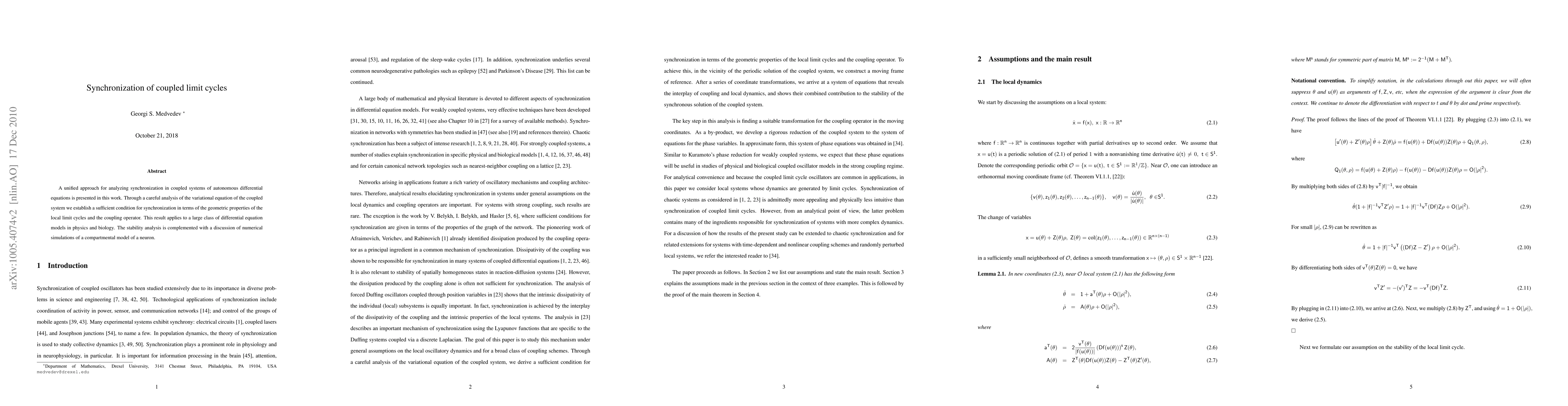 This research introduces a unified method to analyze synchronization in coupled differential equation systems, focusing on limit cycles' geometric properties and coupling operators. It applies broadly to physical and biological models, supplemented with neuron model simulation results.
