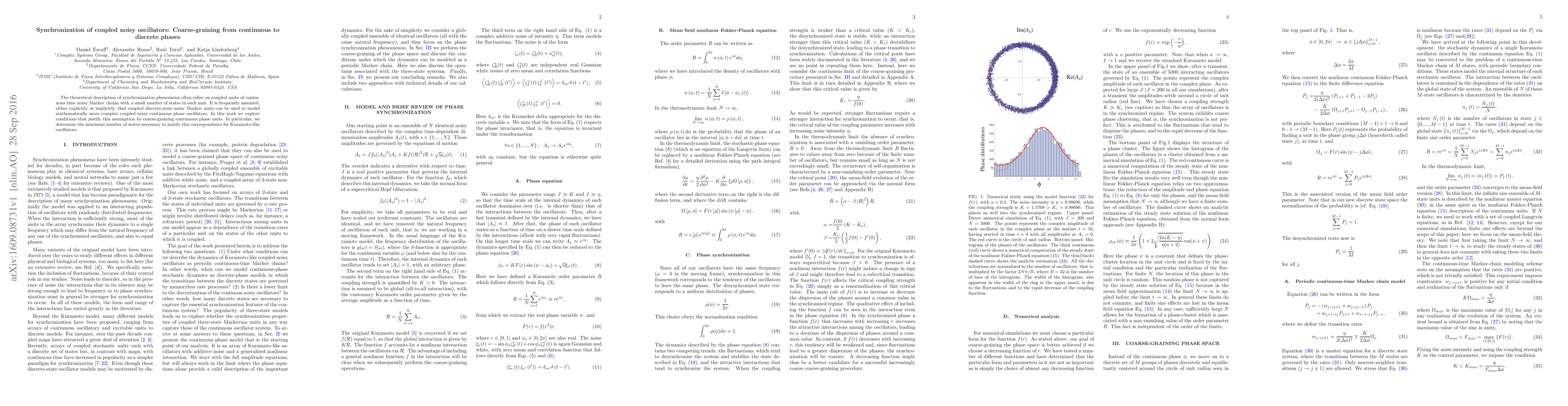 The theoretical description of synchronization phenomena often relies on coupled units of continuous time noisy Markov chains with a small number of states in each unit. It is frequently assumed, either explicitly or implicitly, that coupled discrete-state noisy Markov units can be used to model mathematically more complex coupled noisy continuous phase oscillators. In this work we explore conditions that justify this assumption by coarse-graining continuous phase units. In particular, we determine the minimum number of states necessary to justify this correspondence for Kuramoto-like oscillators.