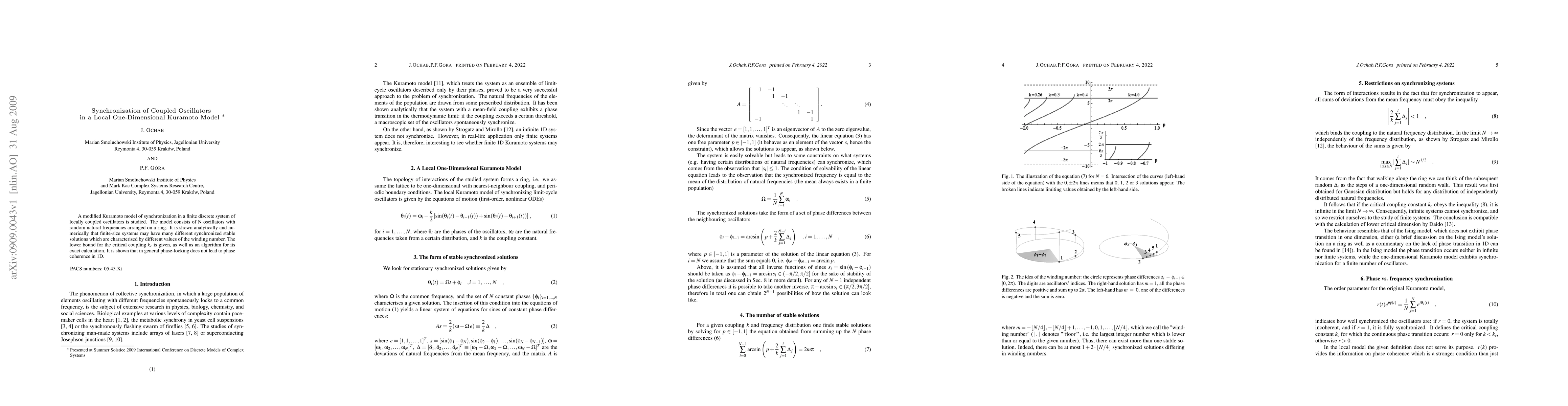 The study explores a modified Kuramoto model for synchronization in a finite, locally coupled system of oscillators arranged on a ring. It reveals the presence of multiple synchronized stable solutions characterized by different winding numbers, along with a method for calculating the critical coupling threshold. The research concludes that phase-locking does not necessarily lead to phase coherence in one-dimensional systems.