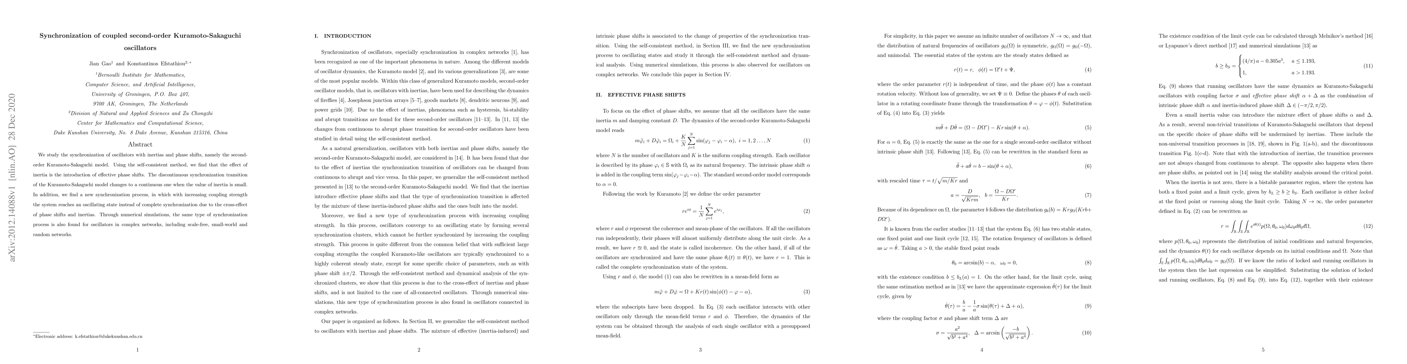 This paper investigates the synchronization behavior of second-order Kuramoto-Sakaguchi oscillators, revealing that inertia introduces effective phase shifts, transforming discontinuous synchronization into continuous synchronization for small inertia values. It also uncovers a novel synchronization process where increased coupling leads to an oscillating state instead of complete synchronization due to the interplay of phase shifts and inertias.