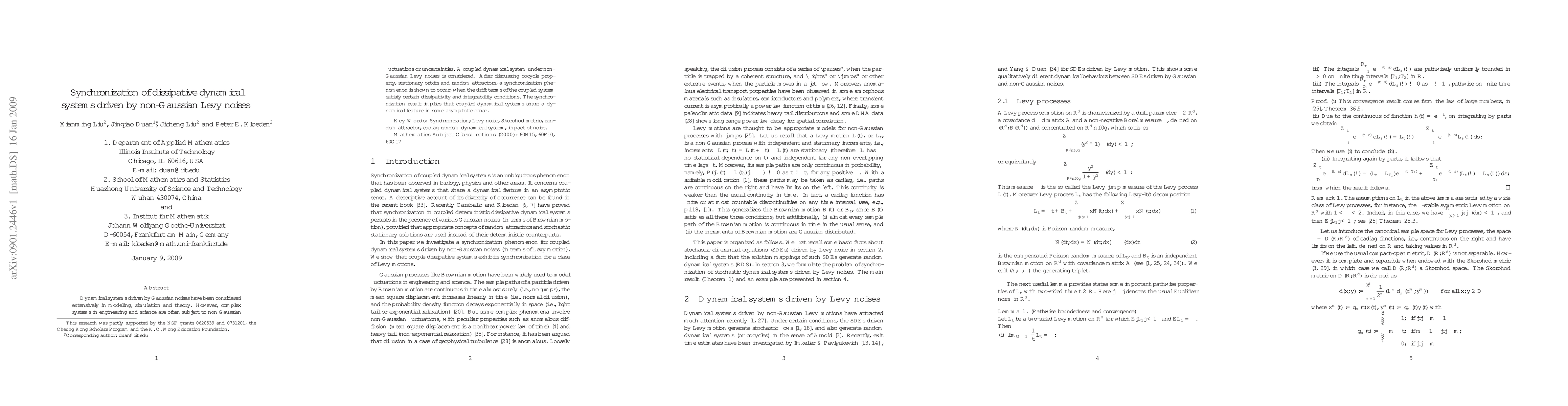 Dynamical systems driven by Gaussian noises have been considered extensively in modeling, simulation and theory. However, complex systems in engineering and science are often subject to non-Gaussian fluctuations or uncertainties. A coupled dynamical system under non- Gaussian Levy noises is considered. After discussing cocycle prop- erty, stationary orbits and random attractors, a synchronization phe- nomenon is shown to occur, when the drift terms of the coupled system satisfy certain dissipativity and integrability conditions. The synchro- nization result implies that coupled dynamical systems share a dy- namical feature in some asymptotic sense.