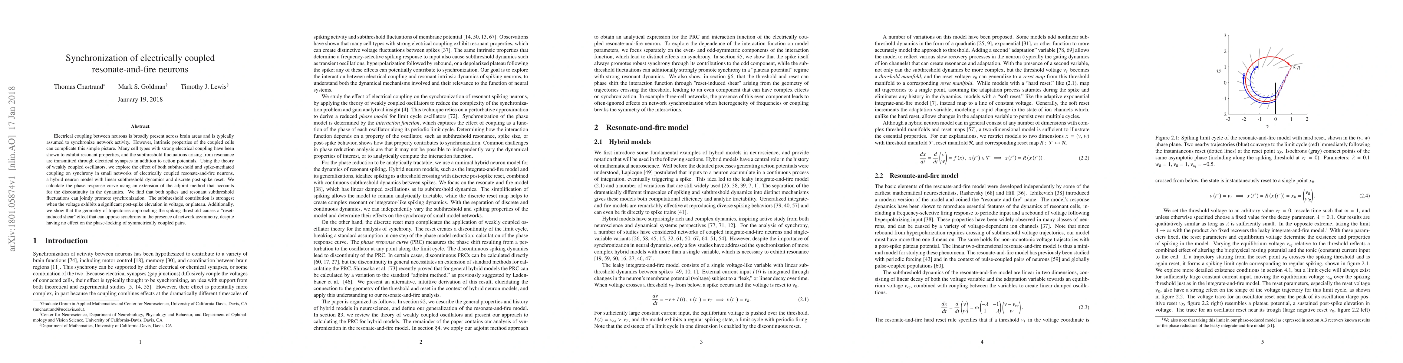 This paper investigates the synchronization of networks of electrically coupled resonate-and-fire neurons, demonstrating that both subthreshold resonant fluctuations and spike-mediated coupling can promote synchrony, with the latter being particularly effective during voltage plateaus. The study also reveals a "reset-induced shear" effect that can disrupt synchrony in asymmetric networks.