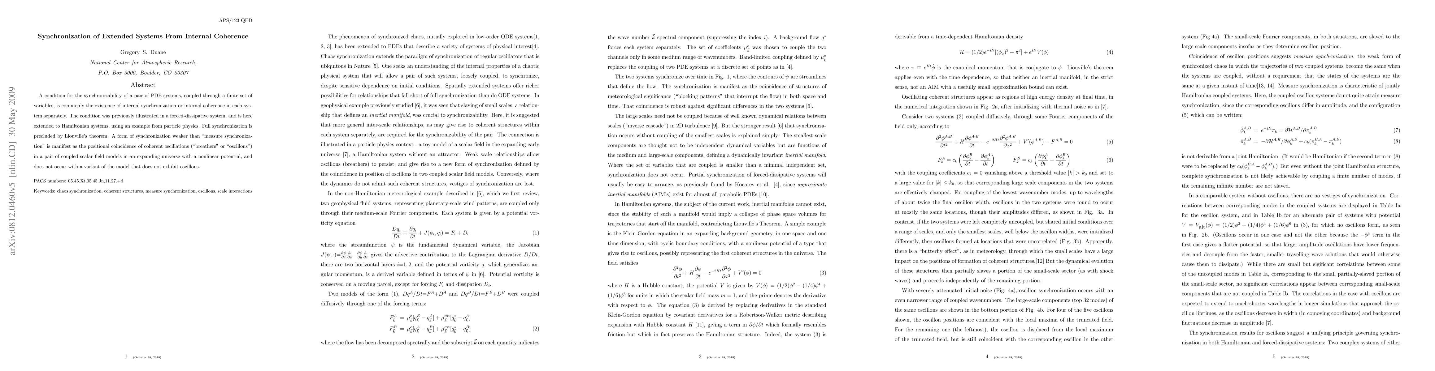 A condition for the synchronizability of a pair of PDE systems, coupled through a finite set of variables, is commonly the existence of internal synchronization or internal coherence in each system separately. The condition was previously illustrated in a forced-dissipative system, and is here extended to Hamiltonian systems, using an example from particle physics. Full synchronization is precluded by Liouville's theorem. A form of synchronization weaker than "measure synchronization" is manifest as the positional coincidence of coherent oscillations ("breathers" or "oscillons") in a pair of coupled scalar field models in an expanding universe with a nonlinear potential, and does not occur with a variant of the model that does not exhibit oscillons.