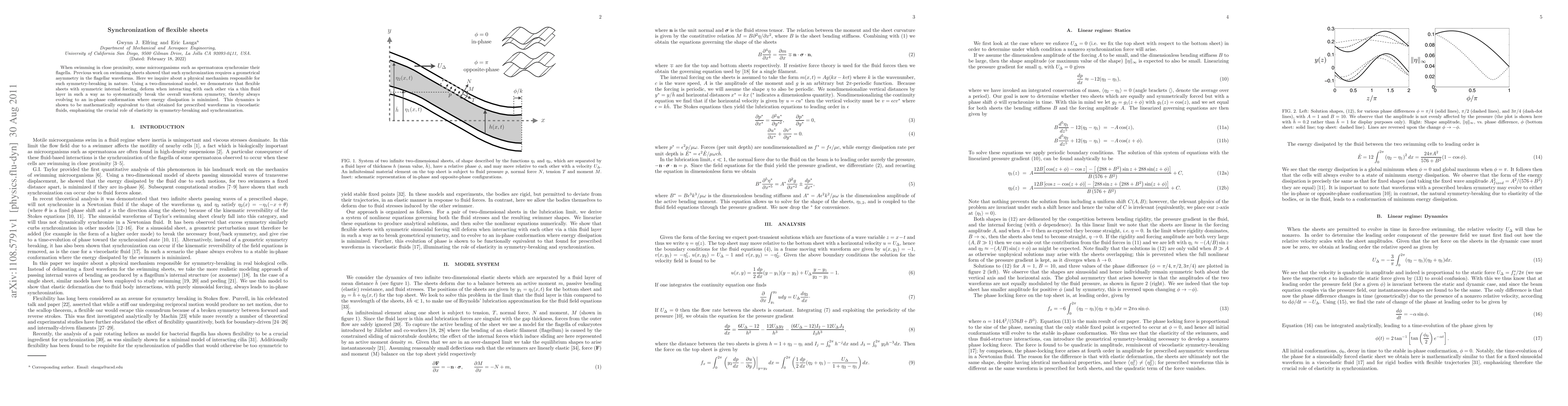 This research investigates the physical mechanism behind the synchronization of flexible sheets, akin to the flagella of swimming microorganisms, showing that symmetric internal forcing can lead to asymmetry through deformation when sheets interact via a fluid layer. The study concludes that elasticity plays a crucial role in breaking symmetry and achieving synchronization, mathematically equivalent to prescribed waveforms in viscoelastic fluids.