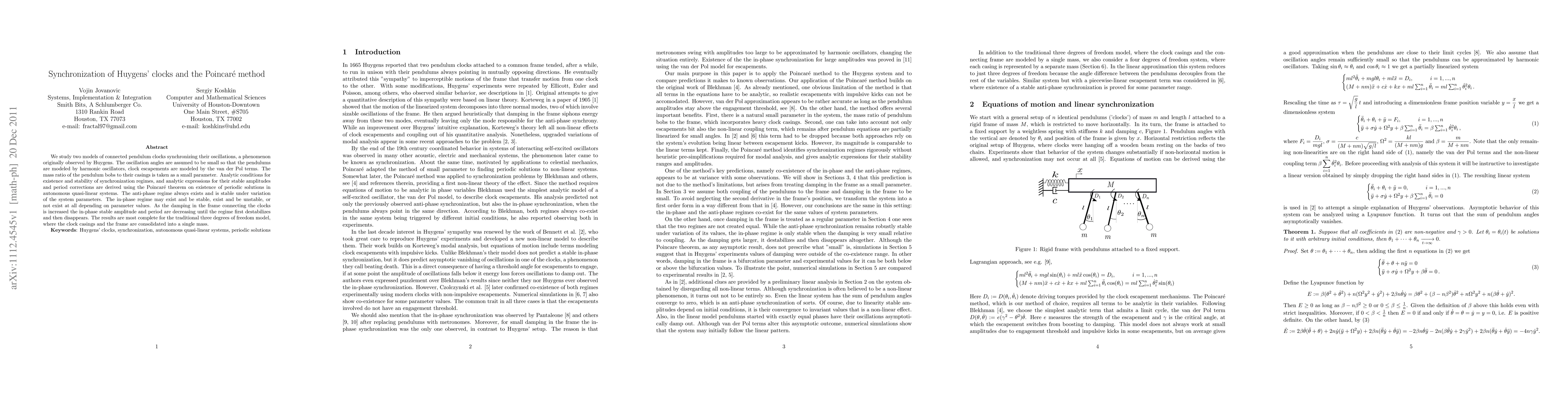 This paper investigates synchronization in connected pendulum clocks modeled as harmonic oscillators with van der Pol escapements. Using Poincaré's theorem, it derives conditions for synchronization stability and amplitude/period corrections, showing that the anti-phase regime is always stable, while the in-phase regime's stability depends on damping parameters and system configurations.