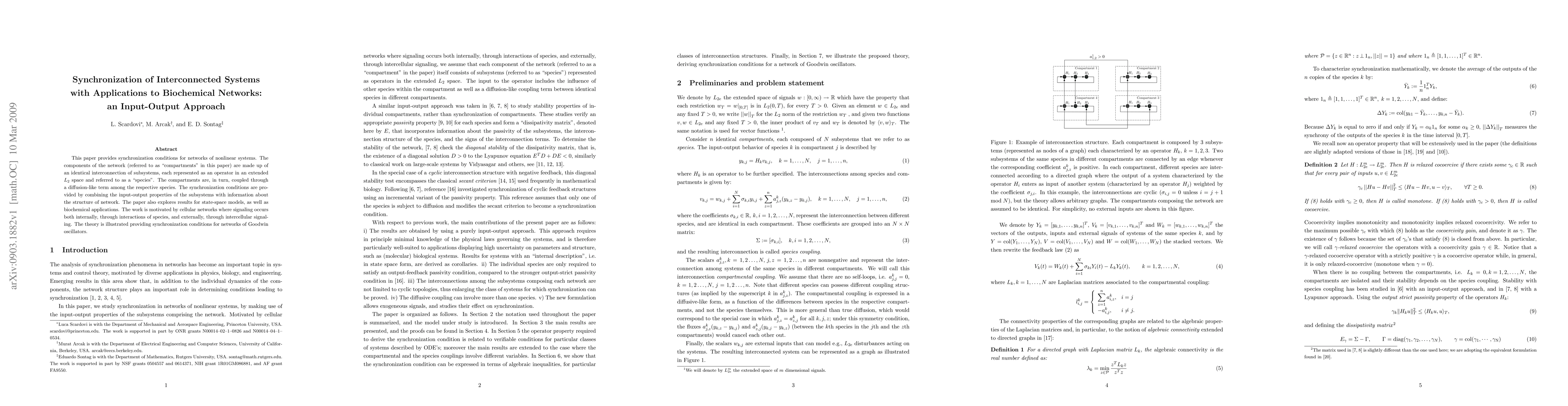 This paper establishes synchronization conditions for networks of nonlinear systems using an input-output approach, focusing on biochemical networks. It combines subsystem properties with network structure to achieve synchronization, illustrated with Goodwin oscillators.