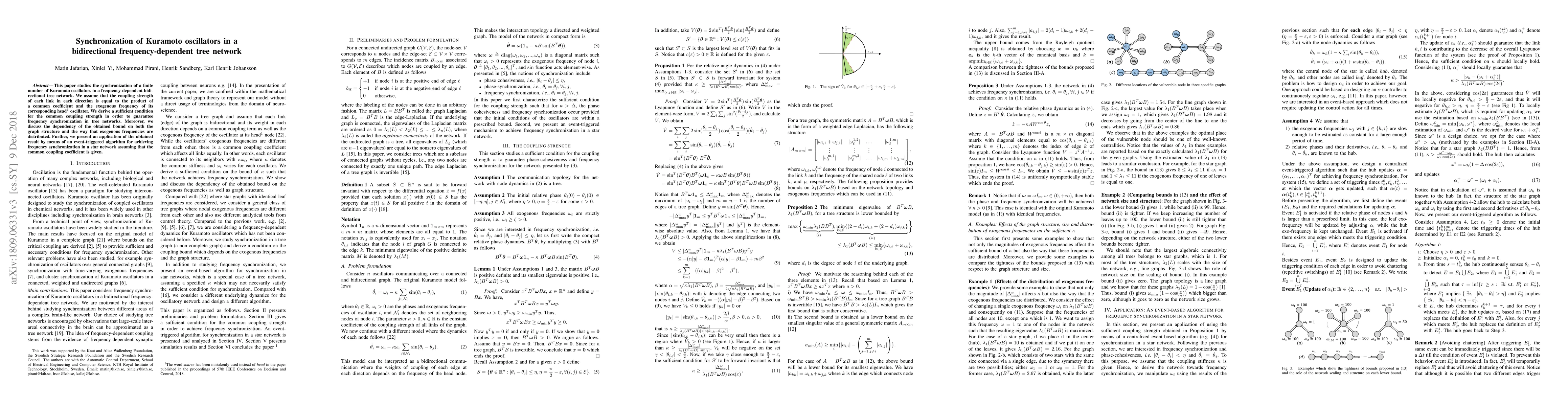 This paper studies the synchronization of a finite number of Kuramoto oscillators in a frequency-dependent bidirectional tree network. We assume that the coupling strength of each link in each direction is equal to the product of a common coefficient and the exogenous frequency of its corresponding head oscillator. We derive a sufficient condition for the common coupling strength in order to guarantee frequency synchronization in tree networks. Moreover, we discuss the dependency of the obtained bound on both the graph structure and the way that exogenous frequencies are distributed. Further, we present an application of the obtained result by means of an event-triggered algorithm for achieving frequency synchronization in a star network assuming that the common coupling coefficient is given.