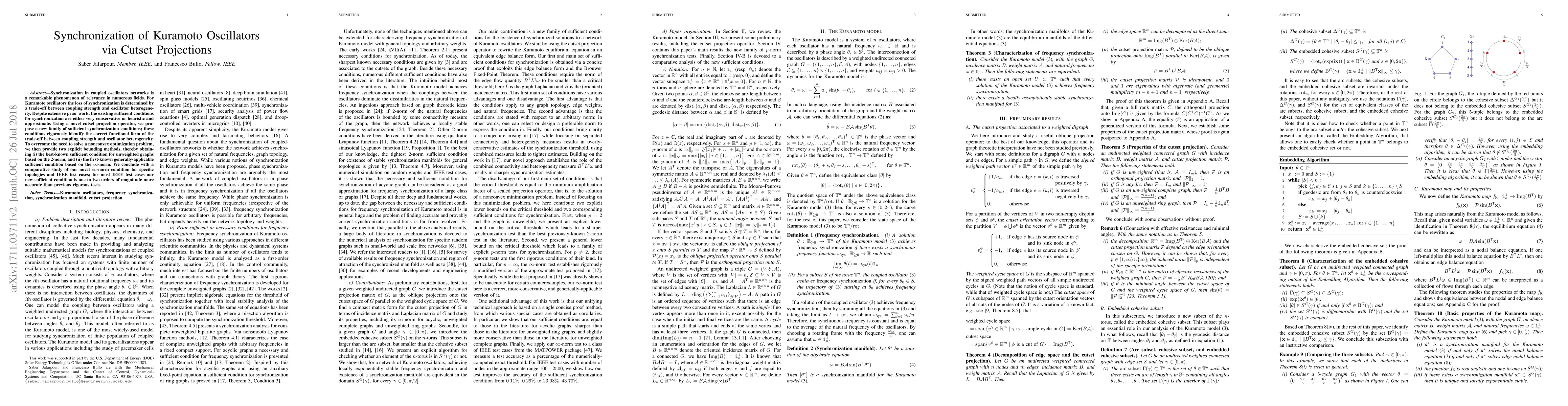 This research introduces cutset projections to establish new, rigorous synchronization conditions for Kuramoto oscillators, addressing the trade-off between coupling strength and oscillator heterogeneity. It presents improved synchronization criteria based on 2-norm and Infinity-norm, demonstrating 1-2 orders of magnitude greater accuracy than previous methods in IEEE test cases.