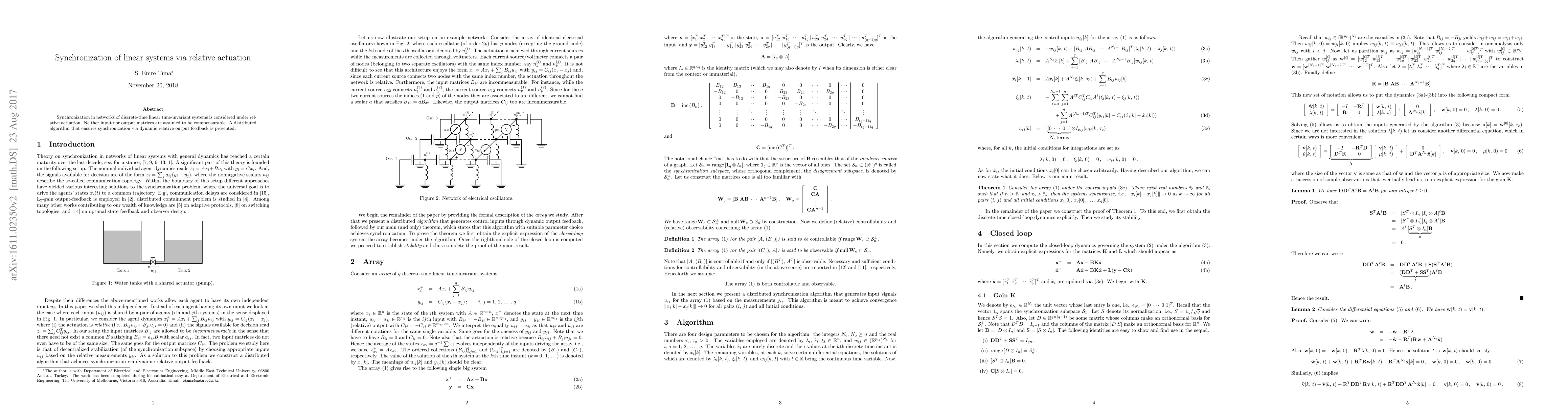 Synchronization in networks of discrete-time linear time-invariant systems is considered under relative actuation. Neither input nor output matrices are assumed to be commensurable. A distributed algorithm that ensures synchronization via dynamic relative output feedback is presented.