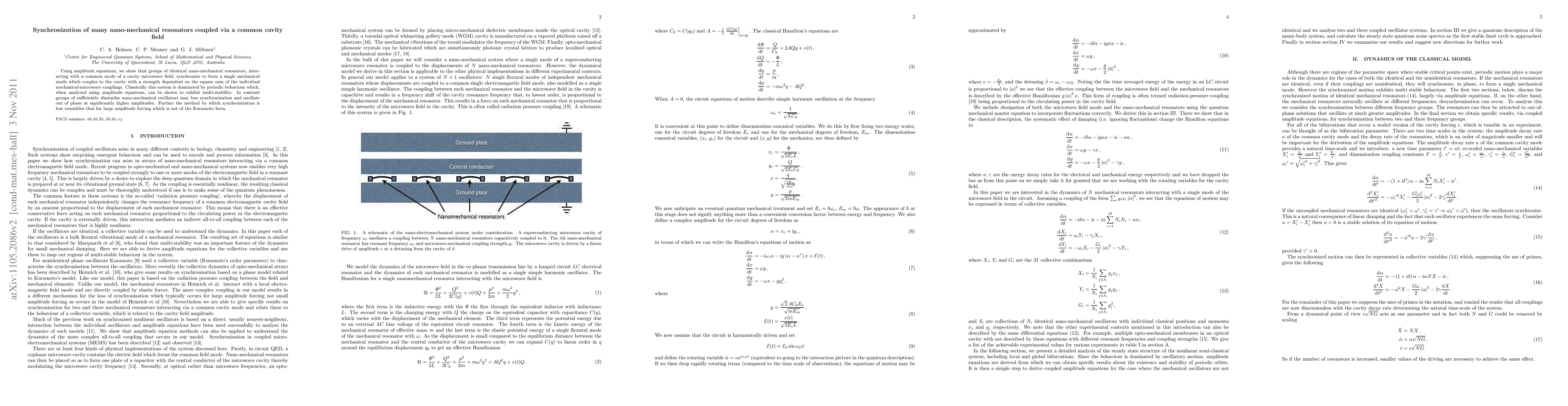 This paper demonstrates that identical nano-mechanical resonators can synchronize via a common cavity microwave field, forming a single mechanical mode with coupling strength dependent on individual couplings. Dissimilar resonators may lose synchronization and oscillate out of phase at higher amplitudes, with a synchronization loss mechanism distinct from the Kuramoto model.