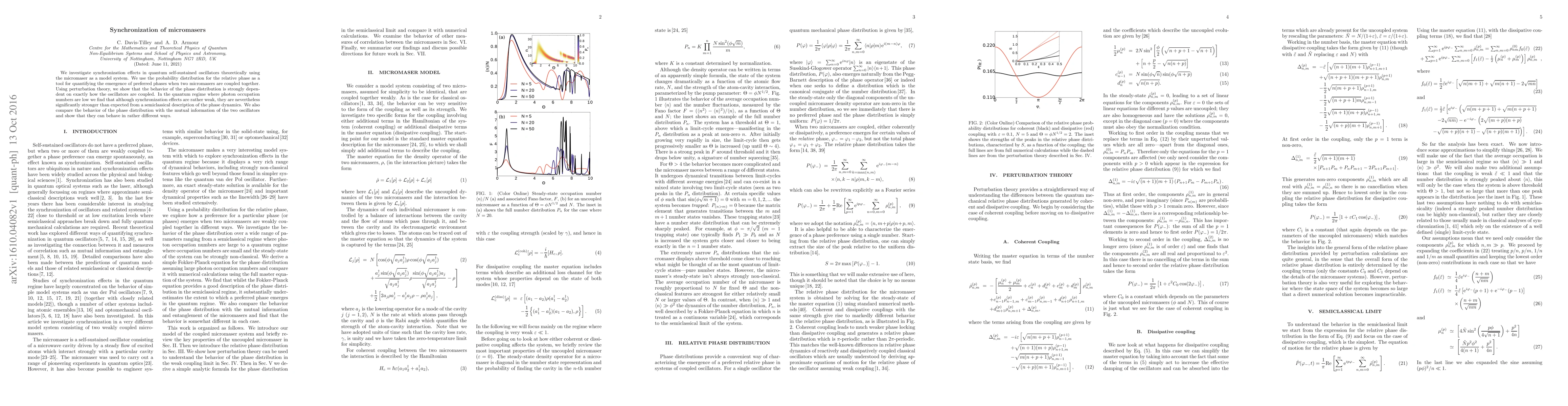 We investigate synchronization effects in quantum self-sustained oscillators theoretically using the micromaser as a model system. We use the probability distribution for the relative phase as a tool for quantifying the emergence of preferred phases when two micromasers are coupled together. Using perturbation theory, we show that the behavior of the phase distribution is strongly dependent on exactly how the oscillators are coupled. In the quantum regime where photon occupation numbers are low we find that although synchronization effects are rather weak, they are nevertheless significantly stronger than expected from a semiclassical description of the phase dynamics. We also compare the behavior of the phase distribution with the mutual information of the two oscillators and show that they can behave in rather different ways.
