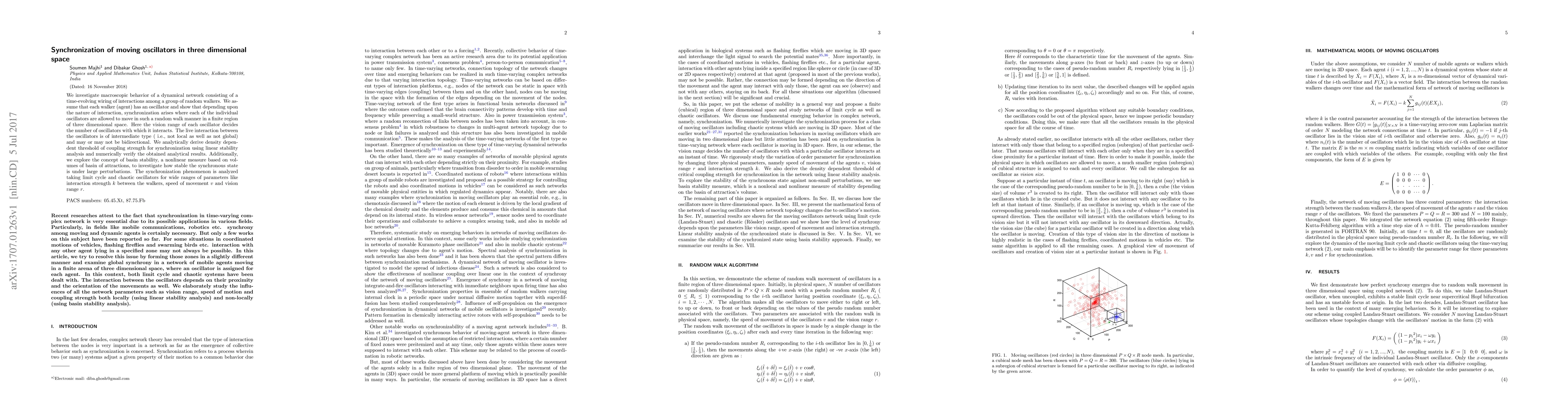 This research explores synchronization in a network of moving oscillators in 3D space. It derives a density-dependent coupling strength threshold for synchronization via linear stability analysis, validated numerically. The study also examines the stability of the synchronous state using basin stability, a nonlinear measure. Synchronization is analyzed with limit cycle and chaotic oscillators across various parameters like interaction strength, movement speed, and vision range.