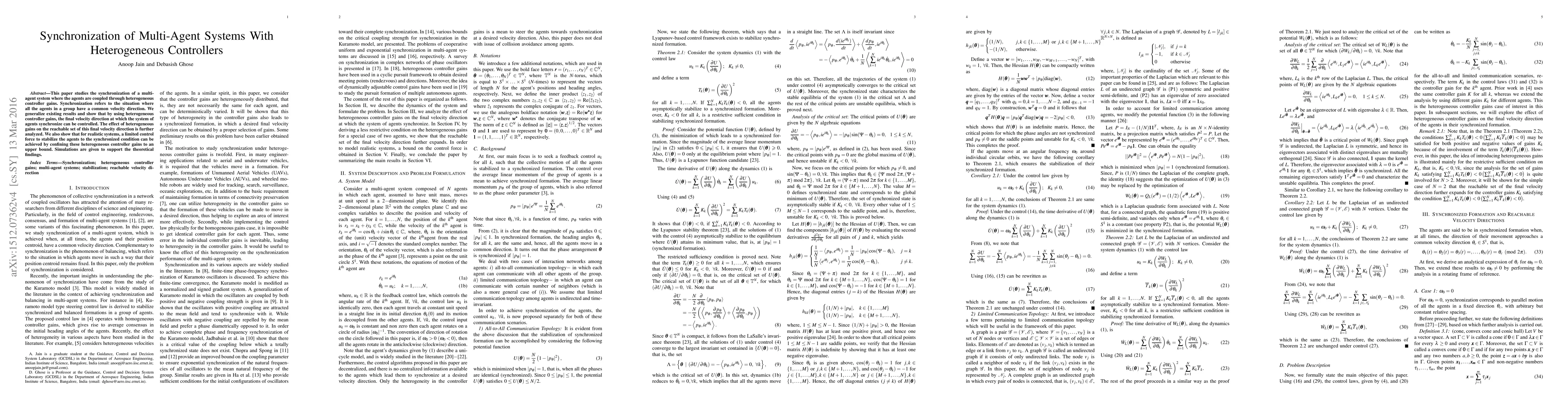 This paper studies the synchronization of a multi-agent system where the agents are coupled through heterogeneous controller gains. Synchronization refers to the situation where all the agents in a group have a common velocity direction. We generalize existing results and show that by using heterogeneous controller gains, the final velocity direction at which the system of agents synchronize can be controlled. The effect of heterogeneous gains on the reachable set of this final velocity direction is further analyzed. We also show that for realistic systems, a limited control force to stabilize the agents to the synchronized condition can be achieved by confining these heterogeneous controller gains to an upper bound. Simulations are given to support the theoretical findings.