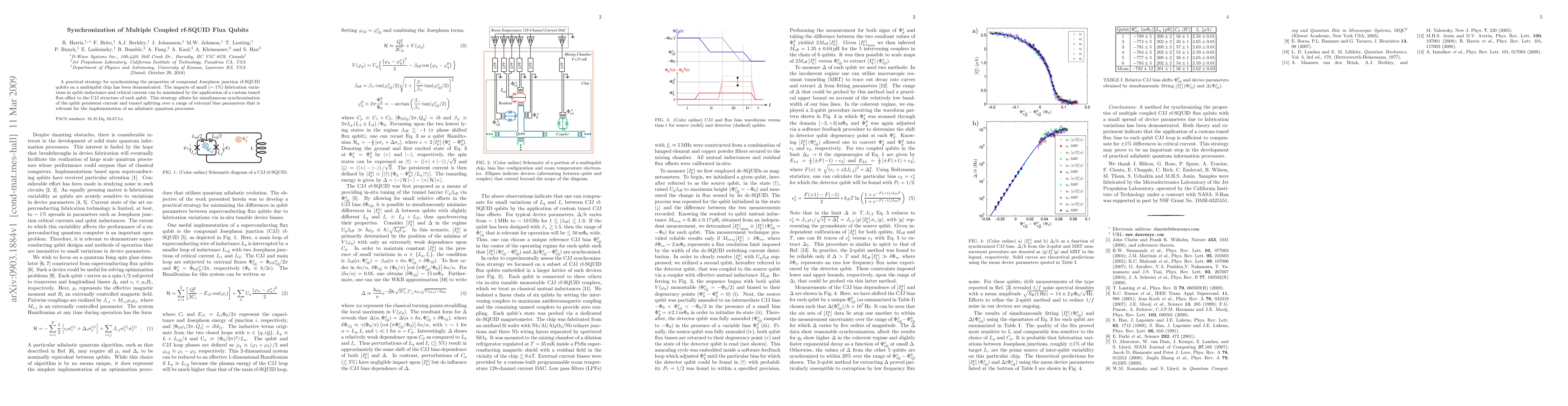 This paper demonstrates a method to synchronize multiple rf-SQUID flux qubits on a chip by adjusting their flux offsets, minimizing fabrication variations and enabling simultaneous synchronization of persistent current and tunnel splitting for quantum processor applications.