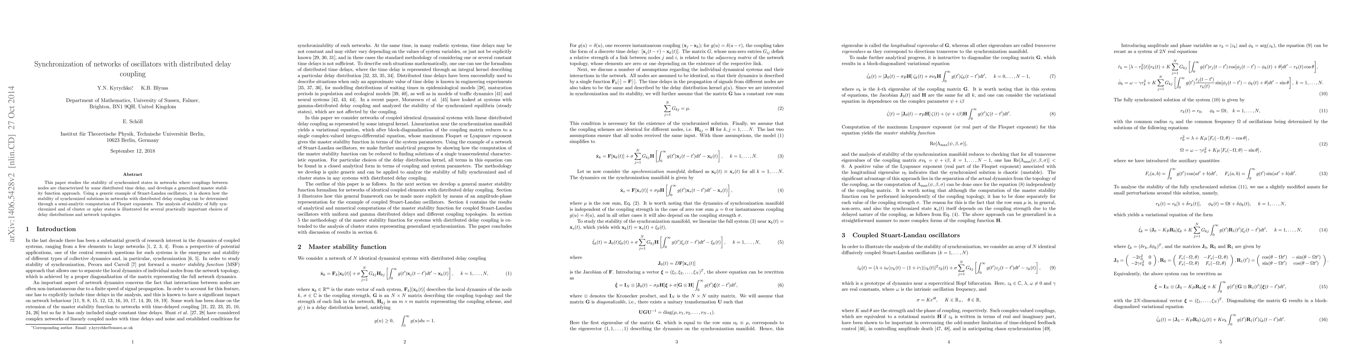 Researchers develop a method to analyze the stability of synchronized states in networks with distributed delay coupling, finding that semi-analytic computation of Floquet exponents can determine stability for various network topologies and delay distributions.