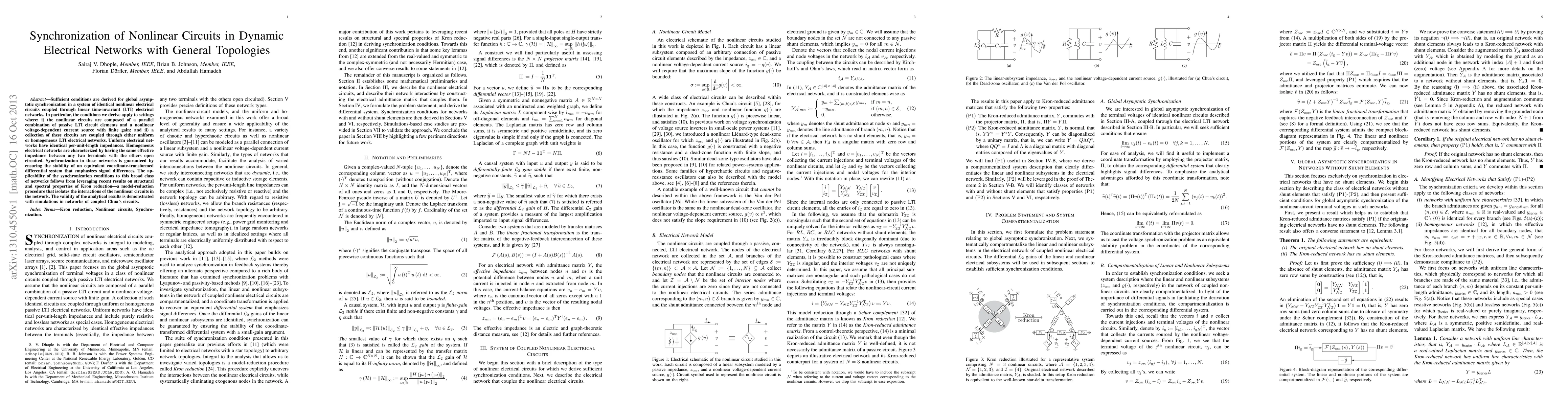 Sufficient conditions are derived for global asymptotic synchronization in a system of identical nonlinear electrical circuits coupled through linear time-invariant (LTI) electrical networks. In particular, the conditions we derive apply to settings where: i) the nonlinear circuits are composed of a parallel combination of passive LTI circuit elements and a nonlinear voltage-dependent current source with finite gain; and ii) a collection of these circuits are coupled through either uniform or homogeneous LTI electrical networks. Uniform electrical networks have identical per-unit-length impedances. Homogeneous electrical networks are characterized by having the same effective impedance between any two terminals with the others open circuited. Synchronization in these networks is guaranteed by ensuring the stability of an equivalent coordinate-transformed differential system that emphasizes signal differences. The applicability of the synchronization conditions to this broad class of networks follows from leveraging recent results on structural and spectral properties of Kron reduction---a model-reduction procedure that isolates the interactions of the nonlinear circuits in the network. The validity of the analytical results is demonstrated with simulations in networks of coupled Chua's circuits.