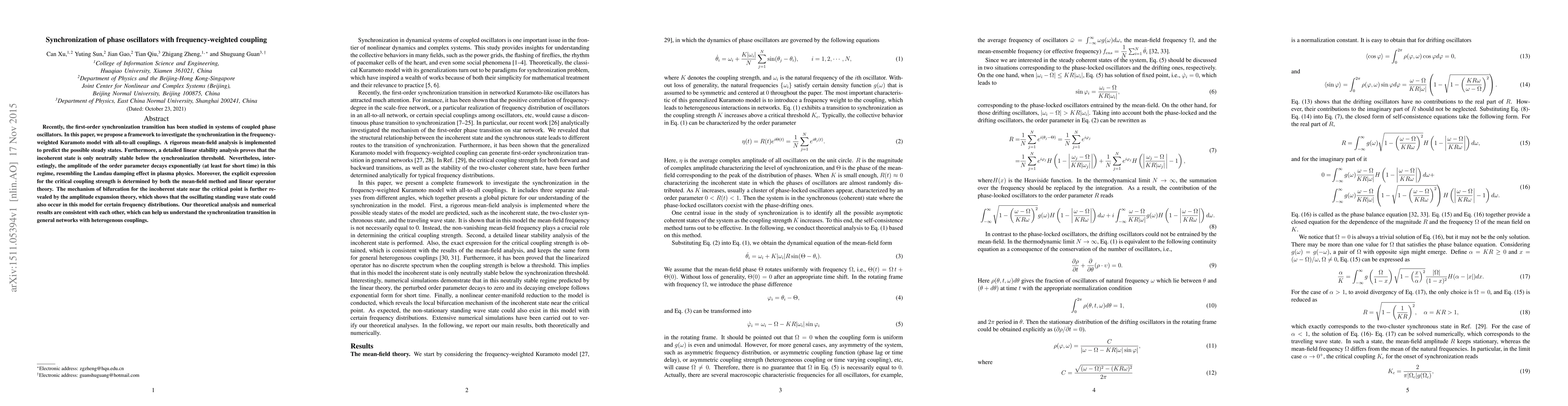 Researchers developed a framework to study synchronization in frequency-weighted Kuramoto models with all-to-all couplings. They found that the amplitude of the order parameter decays exponentially near the synchronization threshold, similar to Landau damping, and identified a mechanism for bifurcation of the incoherent state.