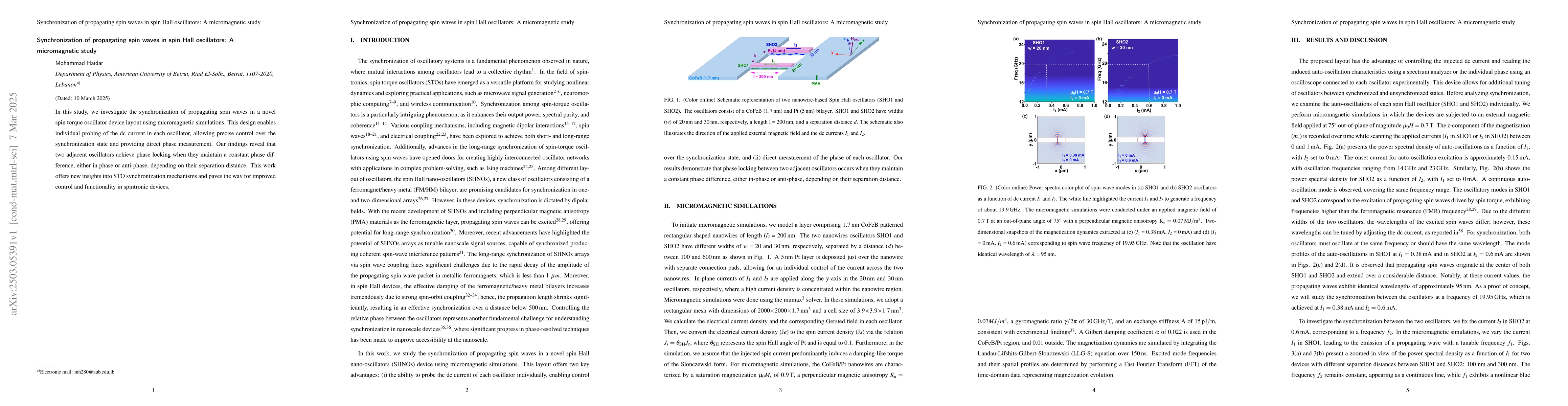 This research presents a novel approach to studying spin wave synchronization in spin Hall oscillators, offering insights into the role of separation distance in determining synchronization phase relationships.