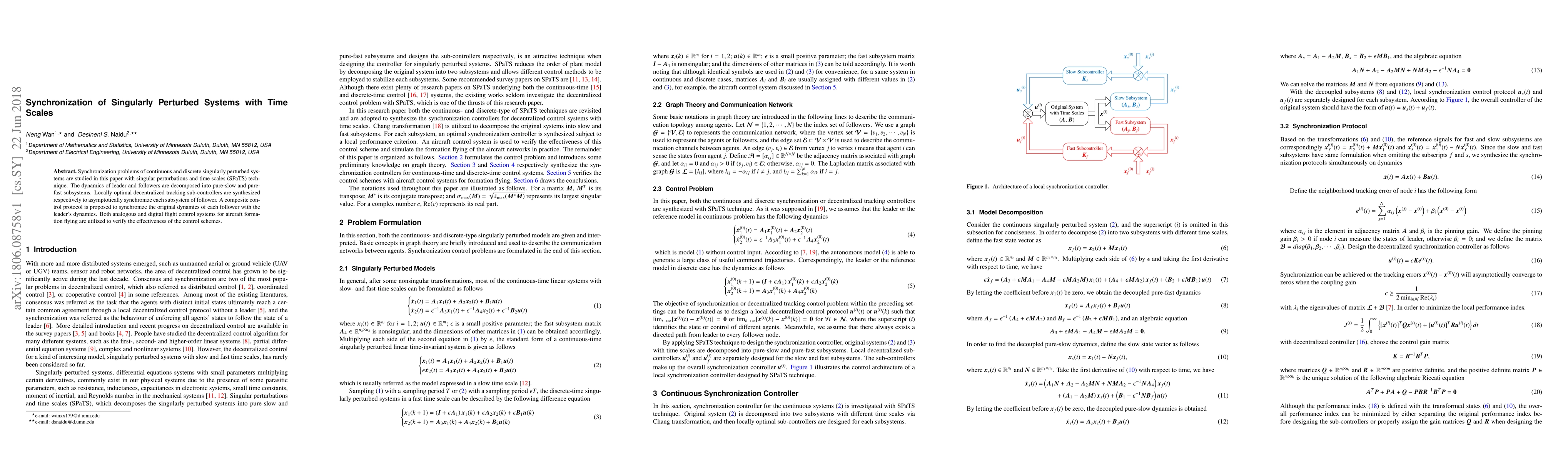 Synchronization problems of continuous and discrete singularly perturbed systems are studied in this paper with singular perturbations and time scales (SPaTS) technique. The dynamics of leader and followers are decomposed into pure-slow and pure-fast subsystems. Locally optimal decentralized tracking sub-controllers are synthesized respectively to asymptotically synchronize each subsystem of follower. A composite control protocol is proposed to synchronize the original dynamics of each follower with the leader's dynamics. Both analogous and digital flight control systems for aircraft formation flying are utilized to verify the effectiveness of the control schemes.