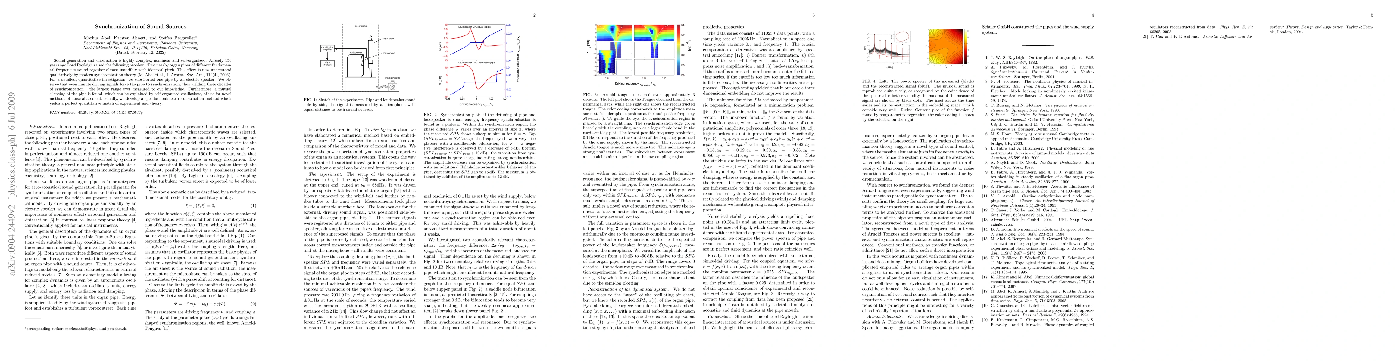 Sound generation and -interaction is highly complex, nonlinear and self-organized. Already 150 years ago Lord Rayleigh raised the following problem: Two nearby organ pipes of different fundamental frequencies sound together almost inaudibly with identical pitch. This effect is now understood qualitatively by modern synchronization theory (M. Abel et al., J. Acoust. Soc. Am., 119(4), 2006). For a detailed, quantitative investigation, we substituted one pipe by an electric speaker. We observe that even minute driving signals force the pipe to synchronization, thus yielding three decades of synchronization -- the largest range ever measured to our knowledge. Furthermore, a mutual silencing of the pipe is found, which can be explained by self-organized oscillations, of use for novel methods of noise abatement. Finally, we develop a specific nonlinear reconstruction method which yields a perfect quantitative match of experiment and theory.