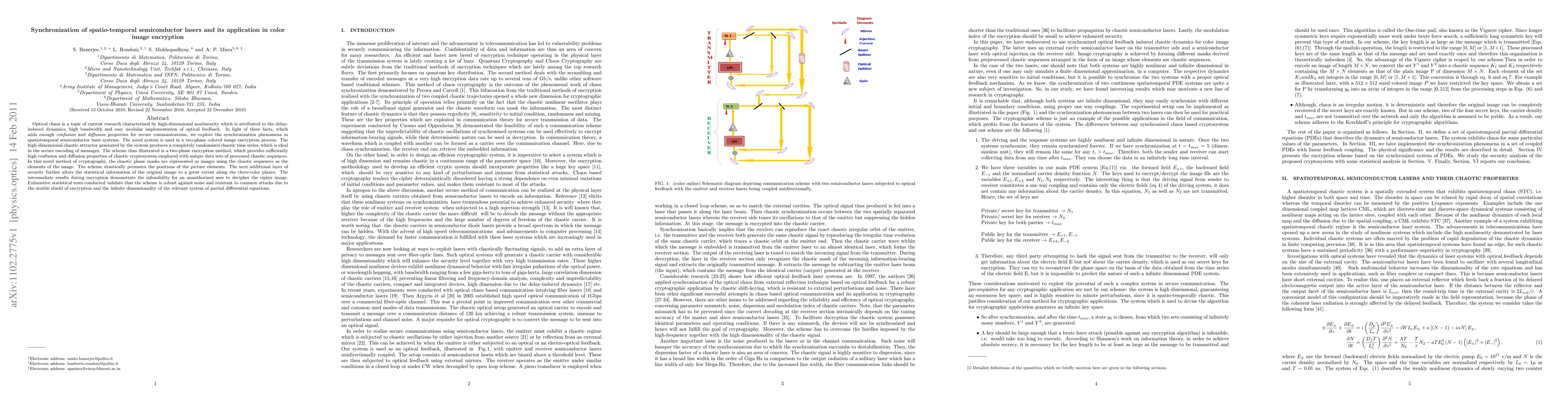 Optical chaos is a topic of current research characterized by high-dimensional nonlinearity which is attributed to the delay-induced dynamics, high bandwidth and easy modular implementation of optical feedback. In light of these facts, which adds enough confusion and diffusion properties for secure communications, we explore the synchronization phenomena in spatiotemporal semiconductor laser systems. The novel system is used in a two-phase colored image encryption process. The high-dimensional chaotic attractor generated by the system produces a completely randomized chaotic time series, which is ideal in the secure encoding of messages. The scheme thus illustrated is a two-phase encryption method, which provides sufficiently high confusion and diffusion properties of chaotic cryptosystem employed with unique data sets of processed chaotic sequences. In this novel method of cryptography, the chaotic phase masks are represented as images using the chaotic sequences as the elements of the image. The scheme drastically permutes the positions of the picture elements. The next additional layer of security further alters the statistical information of the original image to a great extent along the three-color planes. The intermediate results during encryption demonstrate the infeasibility for an unauthorized user to decipher the cipher image. Exhaustive statistical tests conducted validate that the scheme is robust against noise and resistant to common attacks due to the double shield of encryption and the infinite dimensionality of the relevant system of partial differential equations.