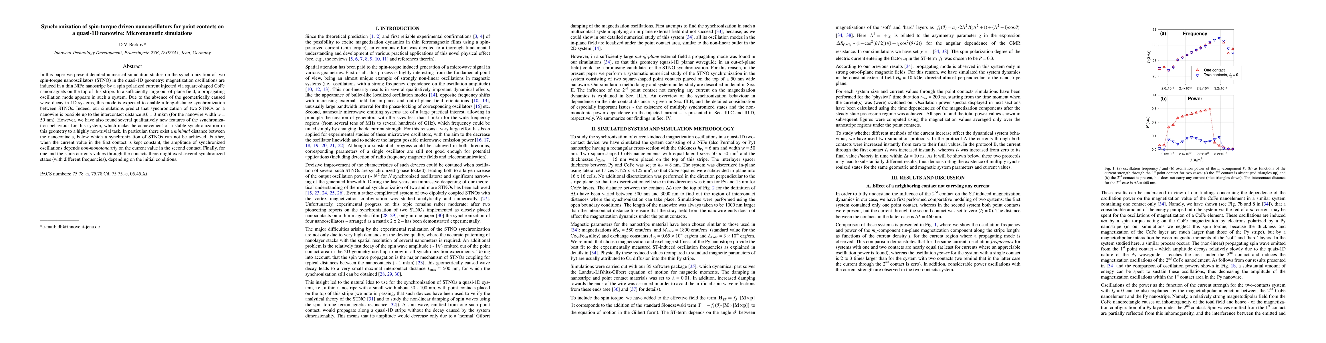 In this paper we present detailed numerical simulation studies on the synchronization of two spin-torque nanooscillators (STNO) in the quasi-1D geometry: magnetization oscillations are induced in a thin NiFe nanostripe by a spin polarized current injected via square-shaped CoFe nanomagnets on the top of this stripe. In a sufficiently large out-of-plane field, a propagating oscillation mode appears in such a system. Due to the absence of the geometrically caused wave decay in 1D systems, this mode is expected to enable a long-distance synchronization between STNOs. Indeed, our simulations predict that synchronization of two STNOs on a nanowire is possible up to the intercontact distance 3 mkm (for the nanowire width 50 nm). However, we have also found several qualitatively new features of the synchronization behaviour for this system, which make the achievement of a stable synchronization in this geometry to a highly non-trivial task. In particular, there exist a minimal distance between the nanocontacts, below which a synchronization of STNOs can not be achieved. Further, when the current value in the first contact is kept constant, the amplitude of synchronized oscillations depends non-monotonously on the current value in the second contact. Finally, for one and the same currents values through the contacts there might exist several synchronized states (with different frequencies), depending on the initial conditions.