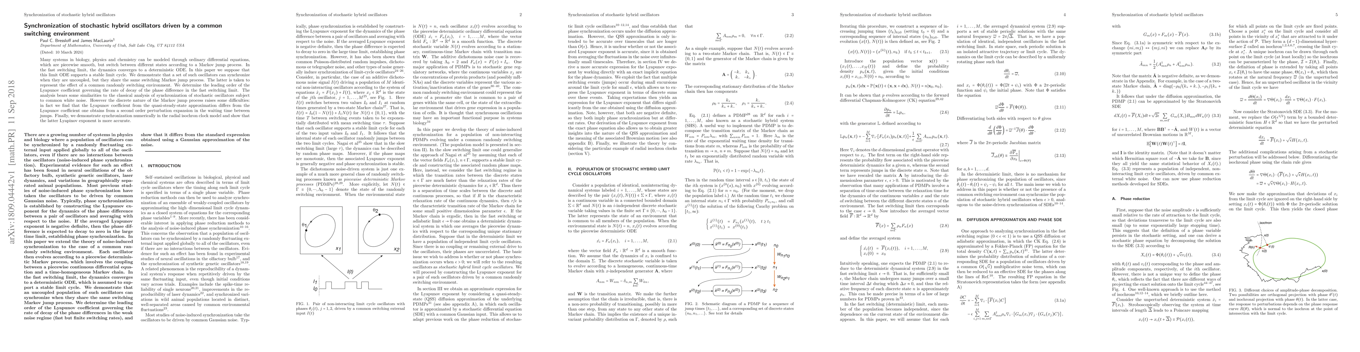Many systems in biology, physics and chemistry can be modeled through ordinary differential equations, which are piecewise smooth, but switch between different states according to a Markov jump process. In the fast switching limit, the dynamics converges to a deterministic ODE. In this paper we suppose that this limit ODE supports a stable limit cycle. We demonstrate that a set of such oscillators can synchronize when they are uncoupled, but they share the same switching Markov jump process. The latter is taken to represent the effect of a common randomly switching environment. We determine the leading order of the Lyapunov coefficient governing the rate of decay of the phase difference in the fast switching limit. The analysis bears some similarities to the classical analysis of synchronization of stochastic oscillators subject to common white noise. However the discrete nature of the Markov jump process raises some difficulties: in fact we find that the Lyapunov coefficient from the quasi-steady-state approximation differs from the Lyapunov coefficient one obtains from a second order perturbation expansion in the waiting time between jumps. Finally, we demonstrate synchronization numerically in the radial isochron clock model and show that the latter Lyapinov exponent is more accurate.