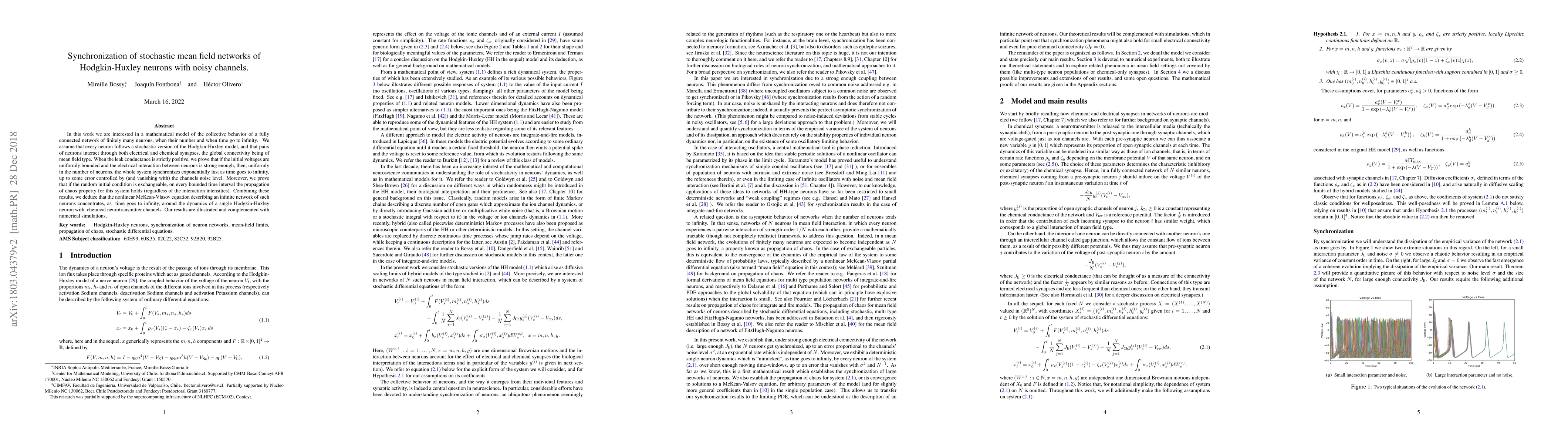 In this work we are interested in a mathematical model of the collective behavior of a fully connected network of finitely many neurons, when their number and when time go to infinity. We assume that every neuron follows a stochastic version of the Hodgkin-Huxley model, and that pairs of neurons interact through both electrical and chemical synapses, the global connectivity being of mean field type. When the leak conductance is strictly positive, we prove that if the initial voltages are uniformly bounded and the electrical interaction between neurons is strong enough, then, uniformly in the number of neurons, the whole system synchronizes exponentially fast as time goes to infinity, up to some error controlled by (and vanishing with) the channels noise level. Moreover, we prove that if the random initial condition is exchangeable, on every bounded time interval the propagation of chaos property for this system holds (regardless of the interaction intensities). Combining these results, we deduce that the nonlinear McKean-Vlasov equation describing an infinite network of such neurons concentrates, as time goes to infinity, around the dynamics of a single Hodgkin-Huxley neuron with chemical neurotransmitter channels. Our results are illustrated and complemented with numerical simulations.