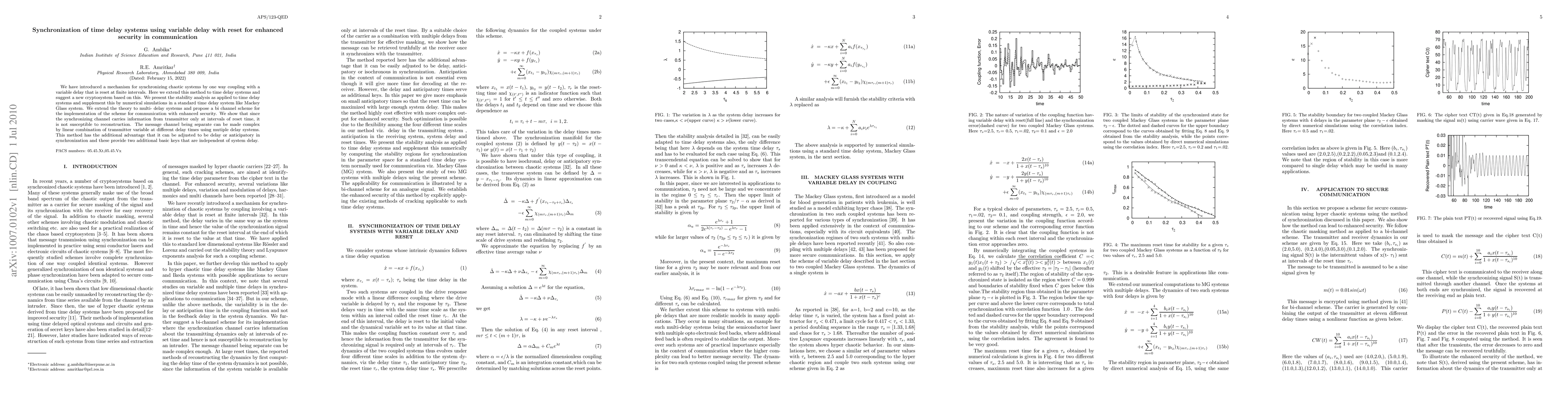 This paper proposes a synchronization method for time delay systems using a variable delay reset mechanism to enhance security in communication. It introduces a new cryptosystem based on this method, demonstrating stability analysis and numerical simulations, and suggests a bi-channel scheme for secure communication that is resistant to reconstruction due to the intermittent information transmission.