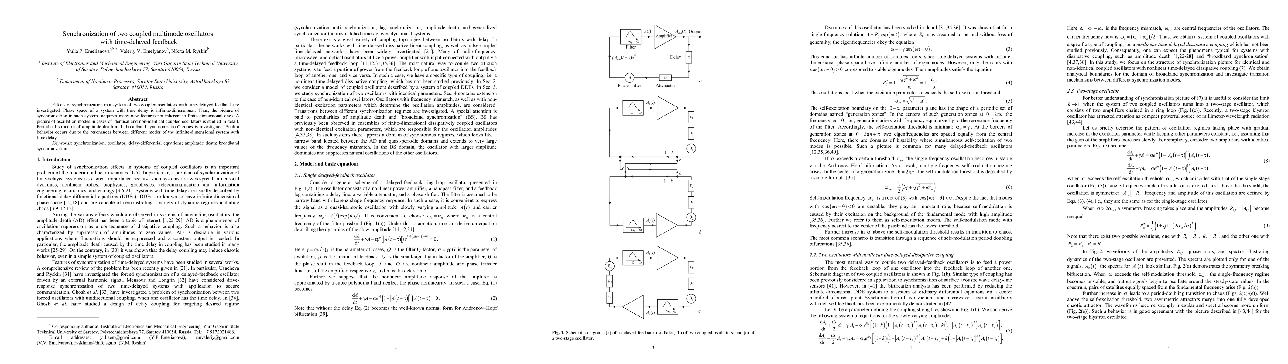 Effects of synchronization in a system of two coupled oscillators with time-delayed feedback are investigated. Phase space of a system with time delay is infinite-dimensional. Thus, the picture of synchronization in such systems acquires many new features not inherent to finite-dimensional ones. A picture of oscillation modes in cases of identical and non-identical coupled oscillators is studied in detail. Periodical structure of amplitude death and "broadband synchronization" zones is investigated. Such a behavior occurs due to the resonances between different modes of the infinite-dimensional system with time delay.