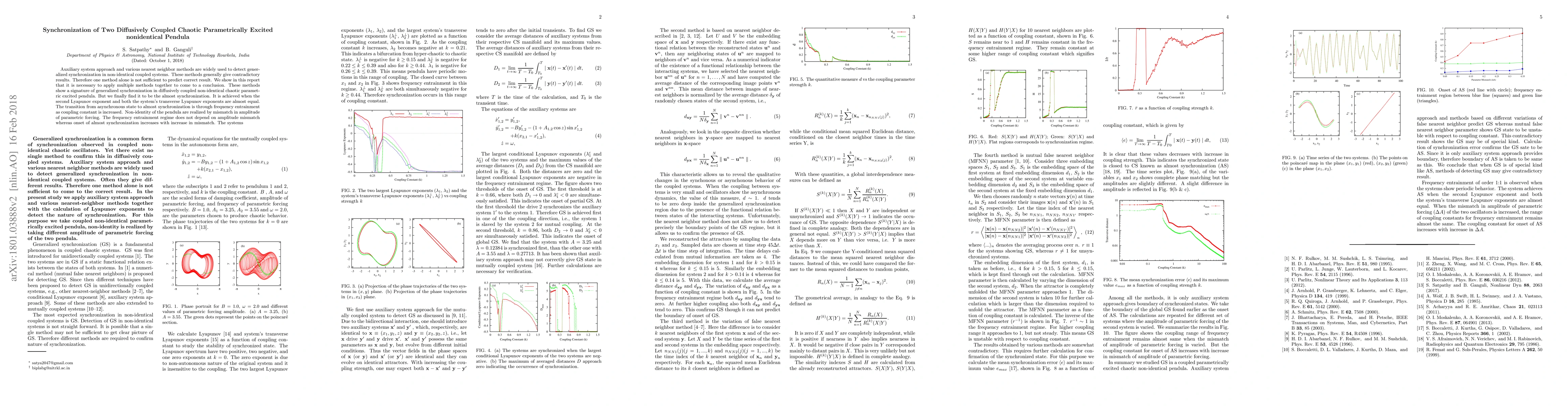 Auxiliary system approach and various nearest neighbor methods are widely used to detect generalized synchronization in non-identical coupled systems. These methods generally give contradictory results. Therefore one method alone is not sufficient to predict correct result. We show in this report that it is necessary to apply multiple methods together to come to a conclusion. These methods show a signature of generalized synchronization in diffusively coupled non-identical chaotic parametric excited pendula. But we finally find it to be the almost synchronization. It is achieved when the second Lyapunov exponent and both the system's transverse Lyapunov exponents are almost equal. The transition from asynchronous state to almost synchronization is through frequency entrainment as coupling constant is increased. Non-identity of the pendula are realized by mismatch in amplitude of parametric forcing. The frequency entrainment regime does not depend on amplitude mismatch whereas onset of almost synchronization increases with increase in mismatch. The systems